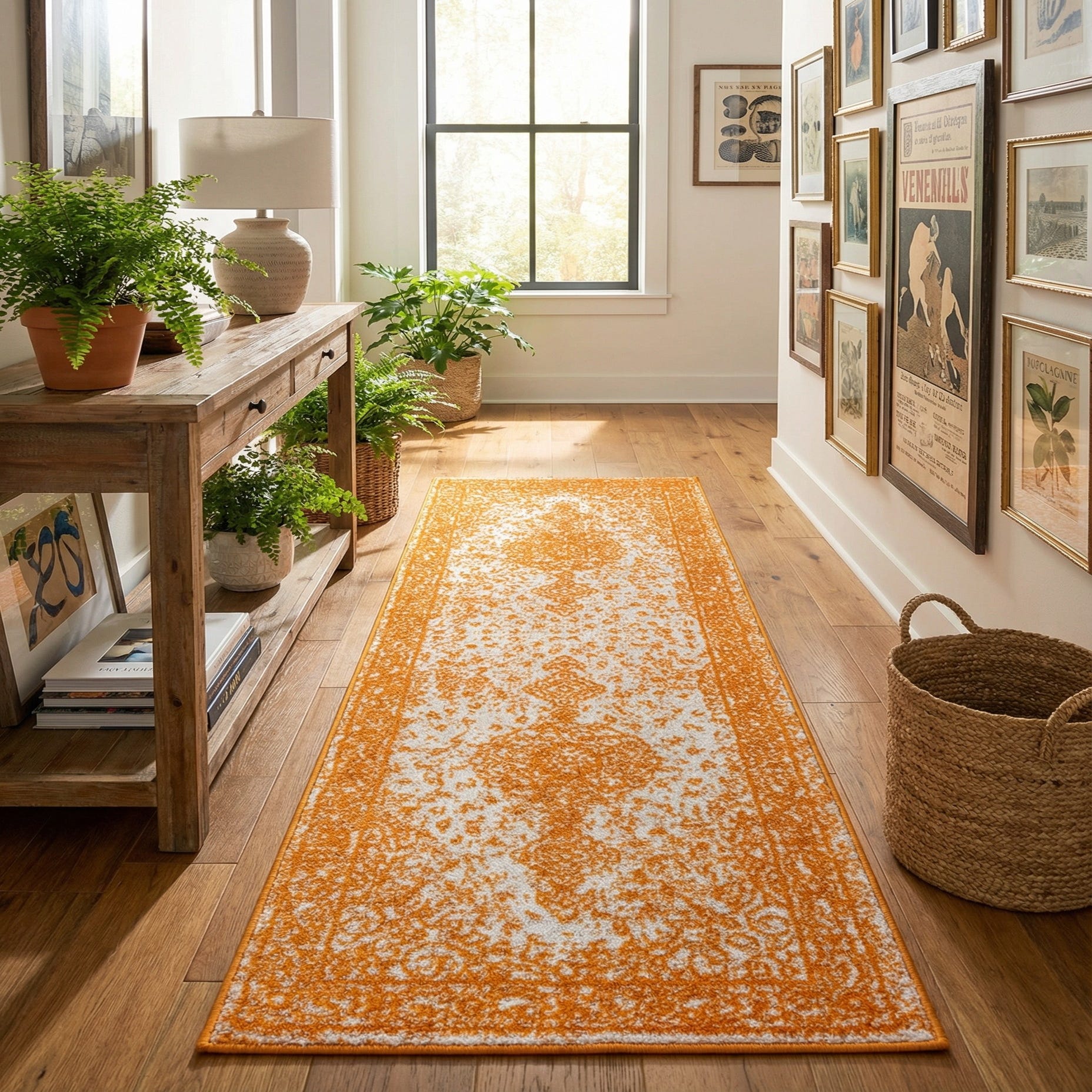 Primary color is Orange. Colors in this rug include: Orange, Ivory.