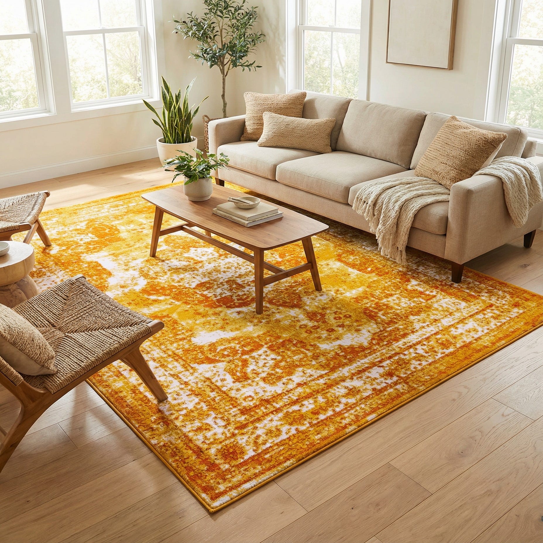 Primary color is Orange. Colors in this rug include: Orange, Gold, Ivory.