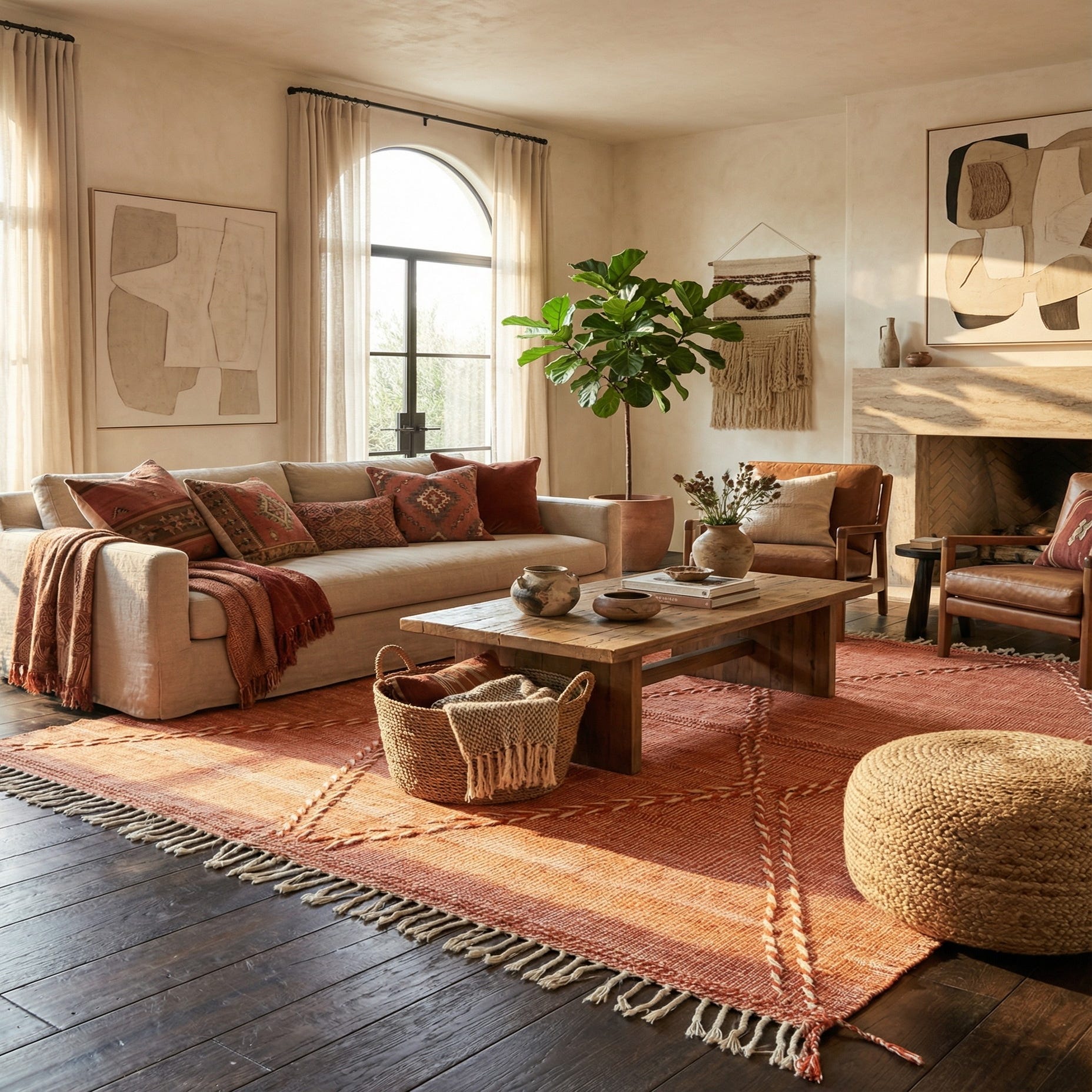 Primary color is Orange. Colors in this rug include: Orange, Ivory.
