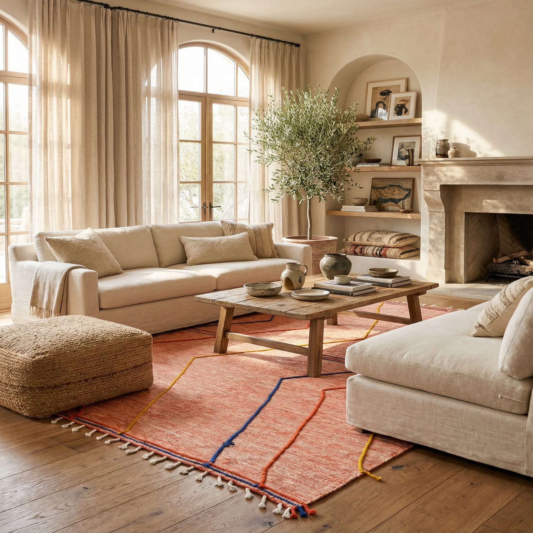 Primary color is Orange. Colors in this rug include: Orange, Blue, Ivory, Yellow.
