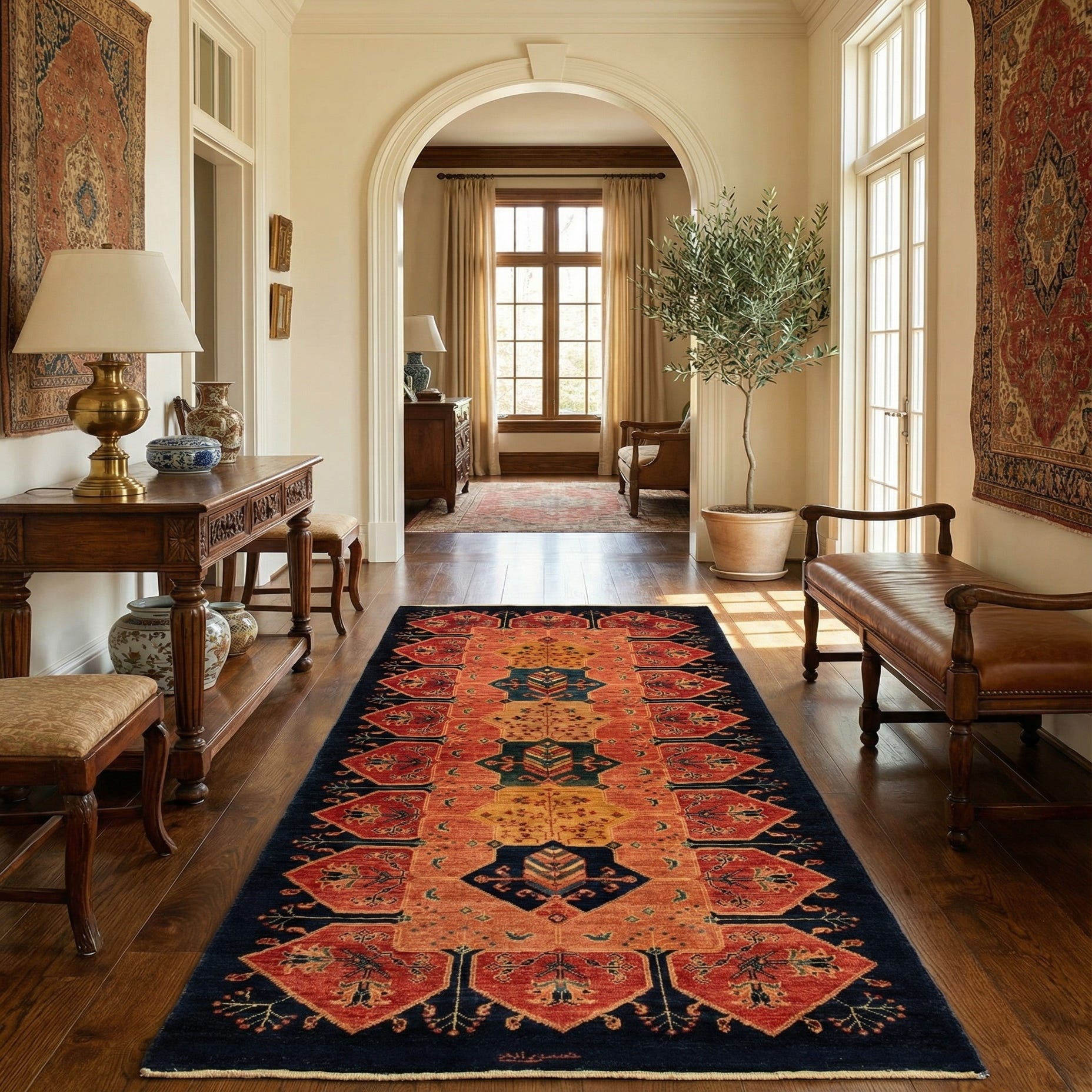 Primary color is Orange. Colors in this rug include: Orange, Black, Red.