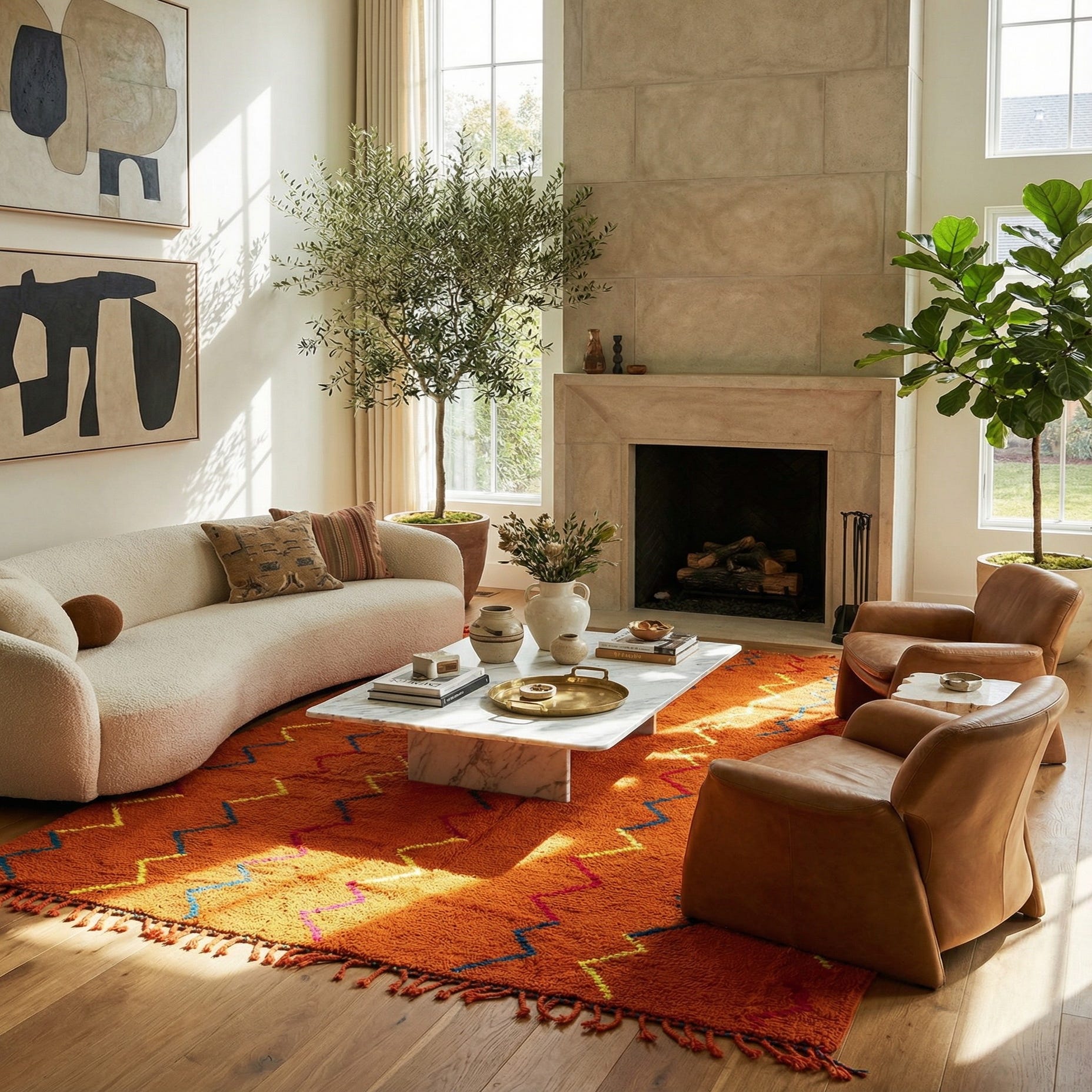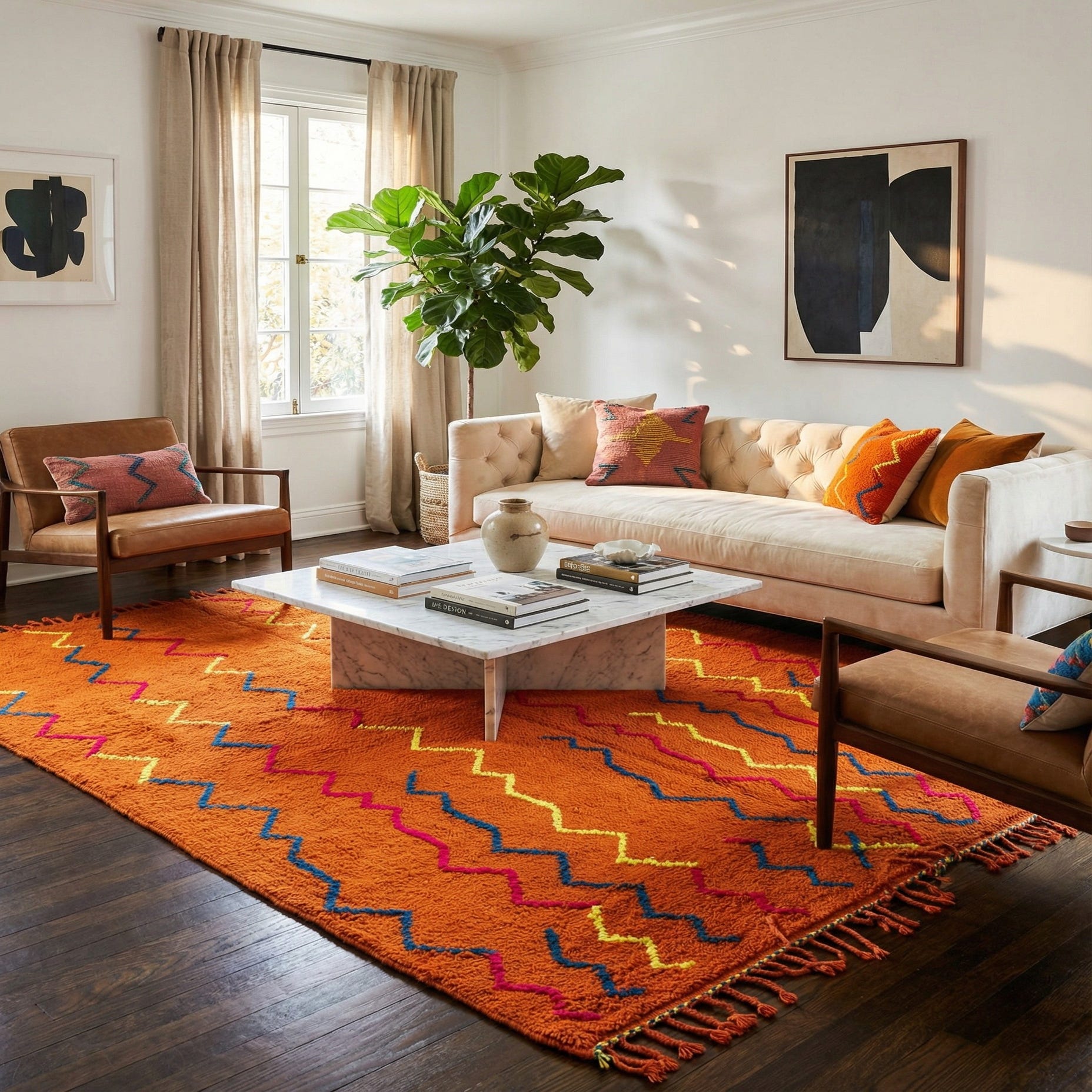 Primary color is Orange. Colors in this rug include: Orange, Blue, Pink, Yellow.