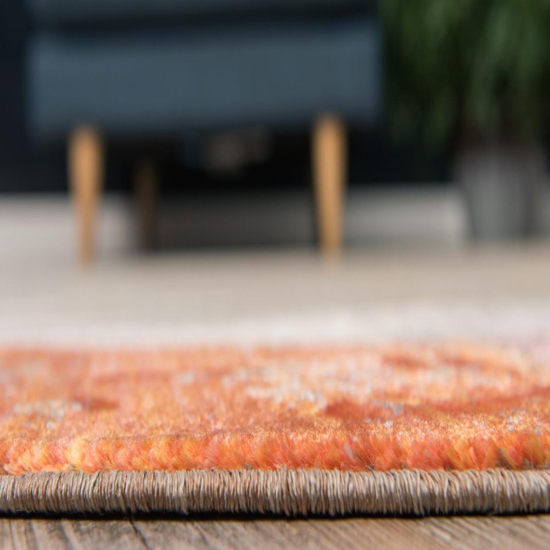 Primary color is Orange. Colors in this rug include: Orange, Blue, Brown, Cream, Purple.