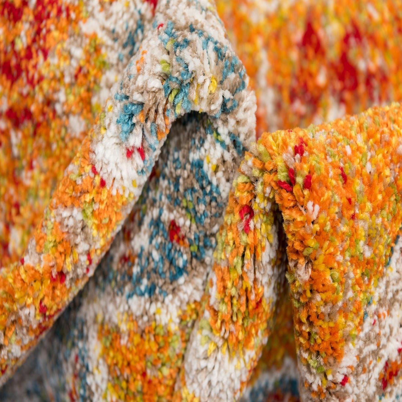 Primary color is Orange. Colors in this rug include: Orange, Beige, Blue, Ivory, Red.