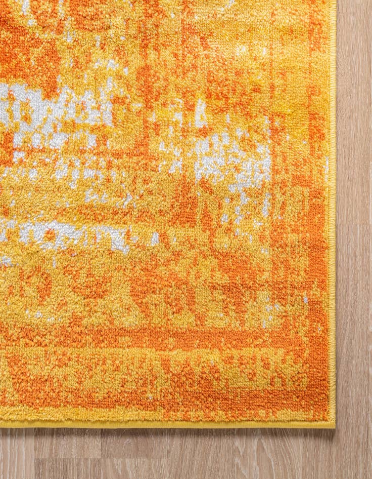 Primary color is Orange. Colors in this rug include: Orange, Gold, Ivory.