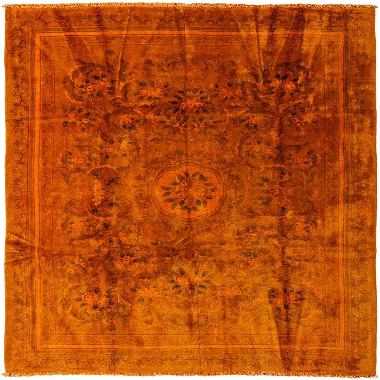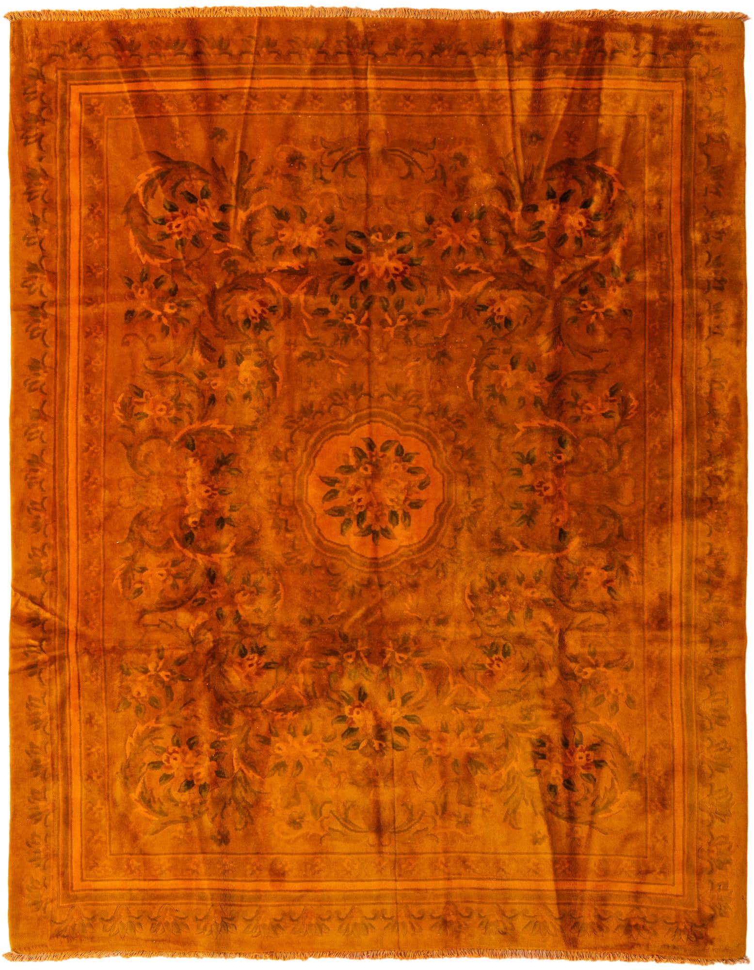 Primary color is Orange. Colors in this rug include: Orange, Brown, Green.