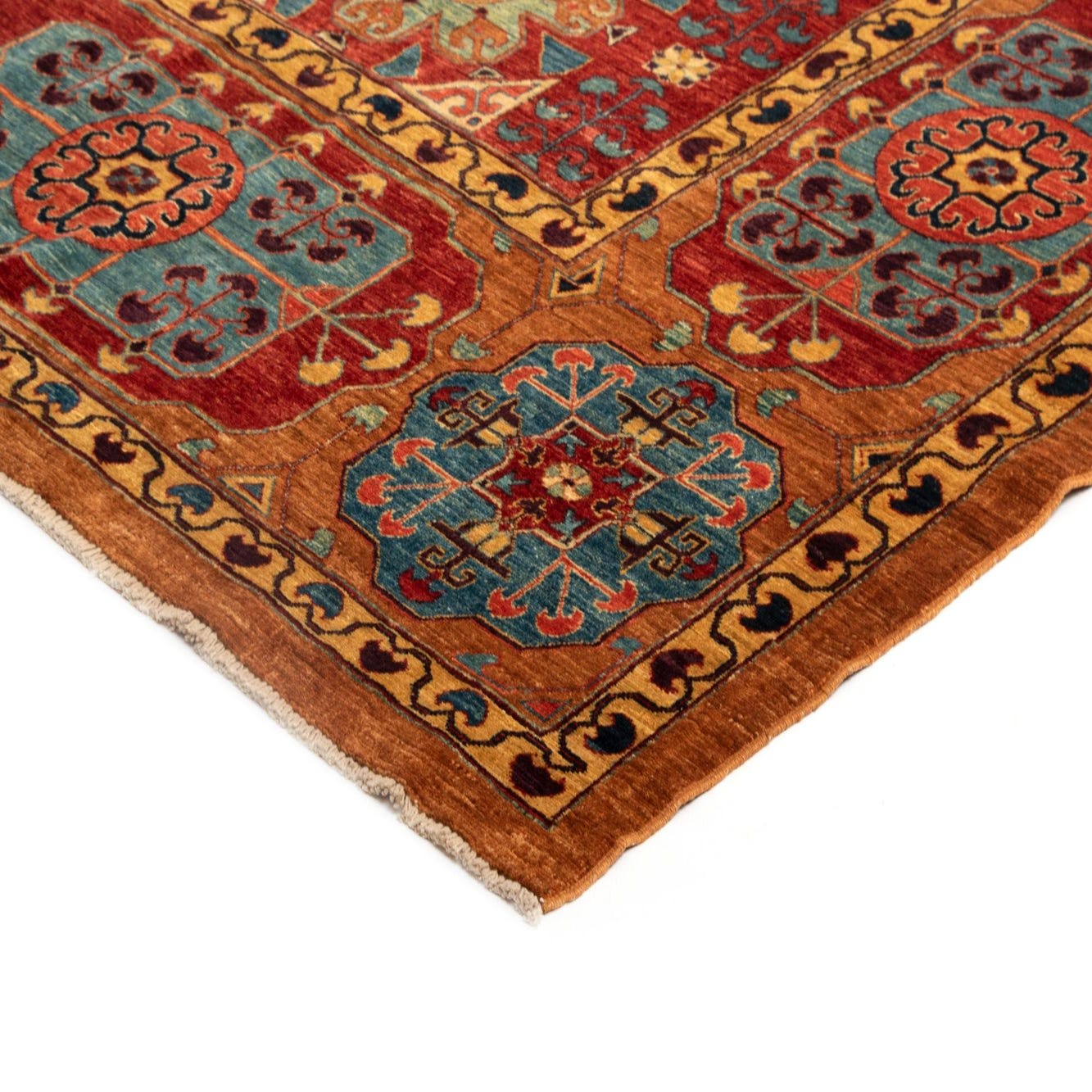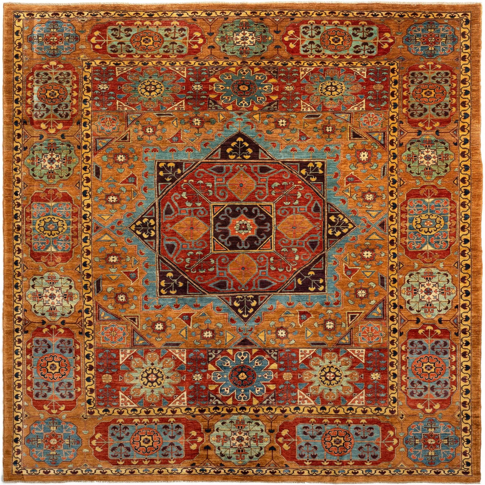 Primary color is Orange. Colors in this rug include: Orange, Orange, Red, Blue, Dark Blue, Beige.