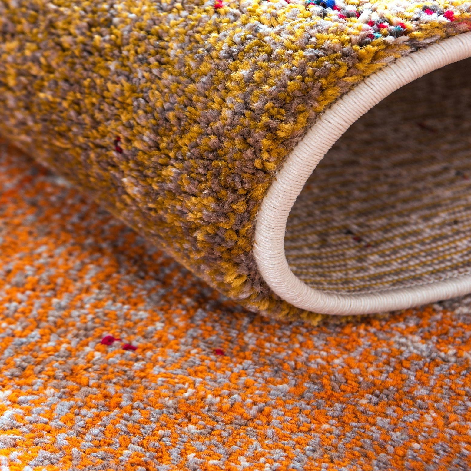 Primary color is Orange. Colors in this rug include: Orange, Burgundy, Gray, Green, Puce, Red, Navy Blue, Beige, Black.