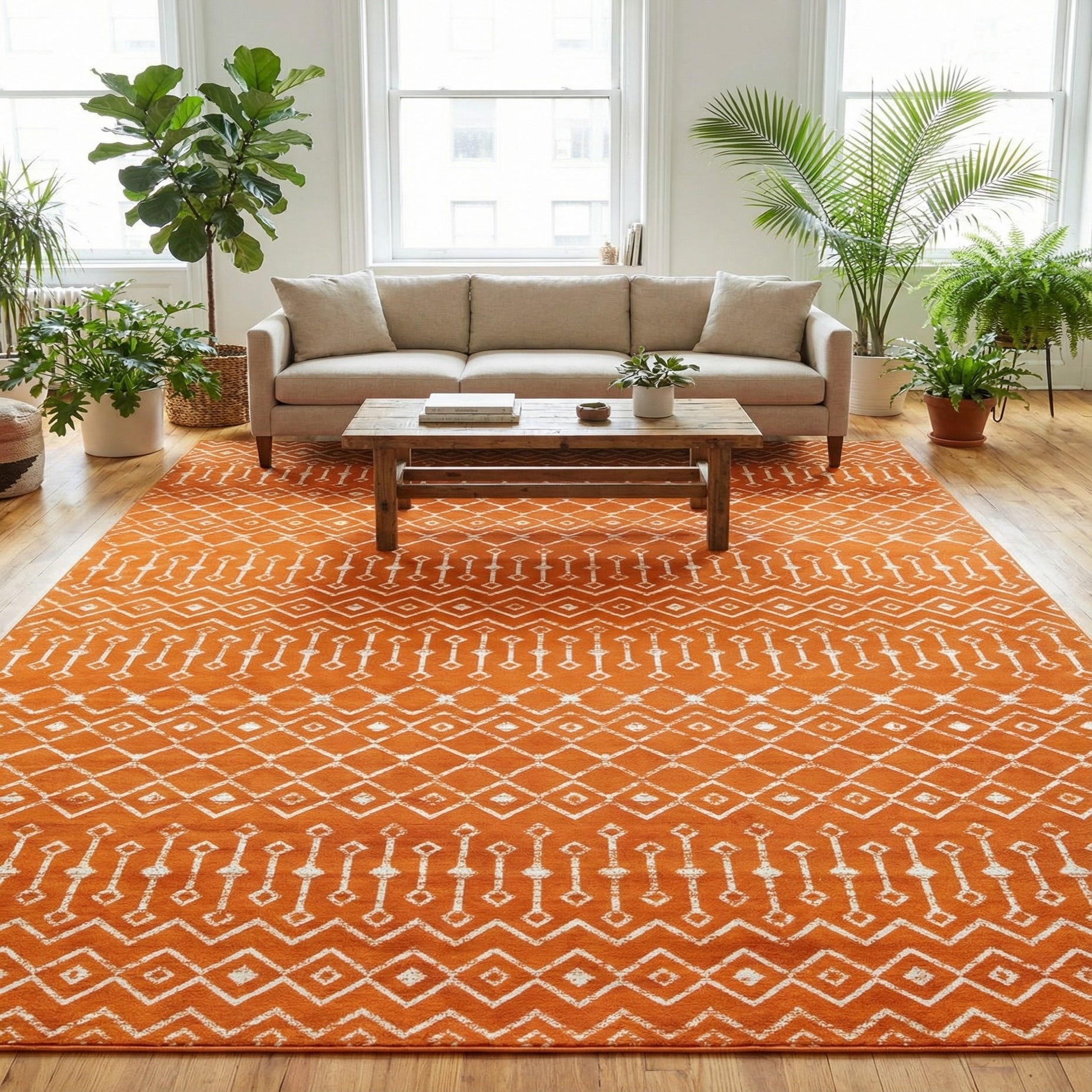 Primary color is Orange. Colors in this rug include: Orange, Ivory.