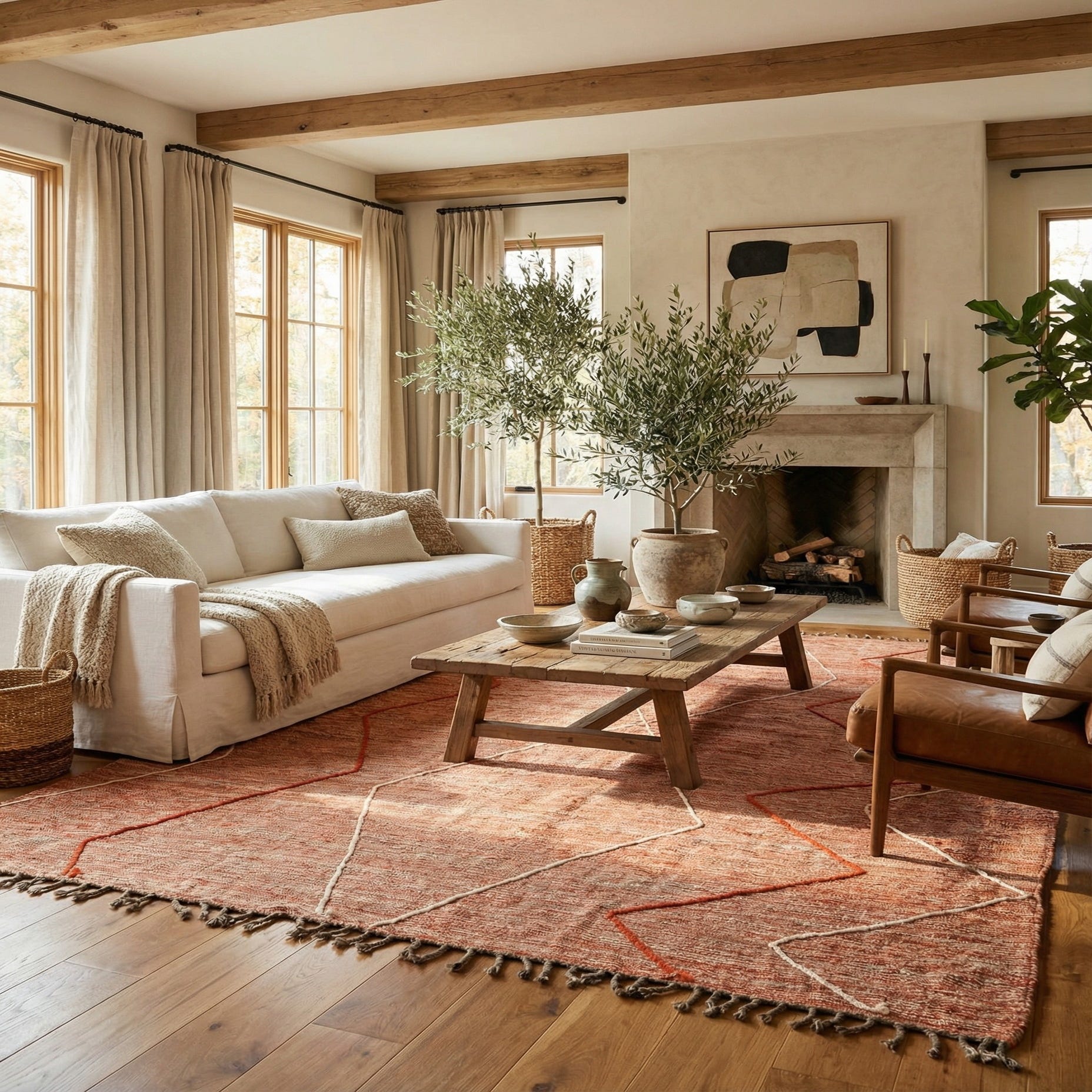 Primary color is Orange. Colors in this rug include: Orange, Ivory.