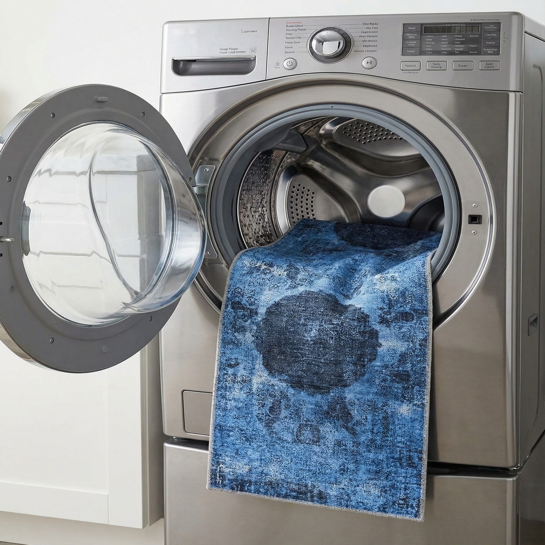 Primary color is Overdyed Blue. Colors in this rug include: Overdyed Blue, Black, Blue, Ivory, Light Blue.