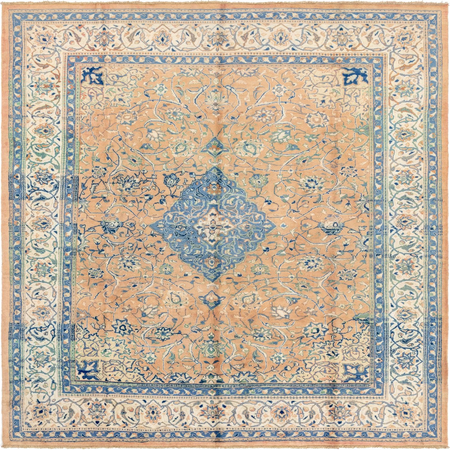 Primary color is Peach. Colors in this rug include: Peach, Brown, Cream, Navy Blue, Olive, Blue, Green.