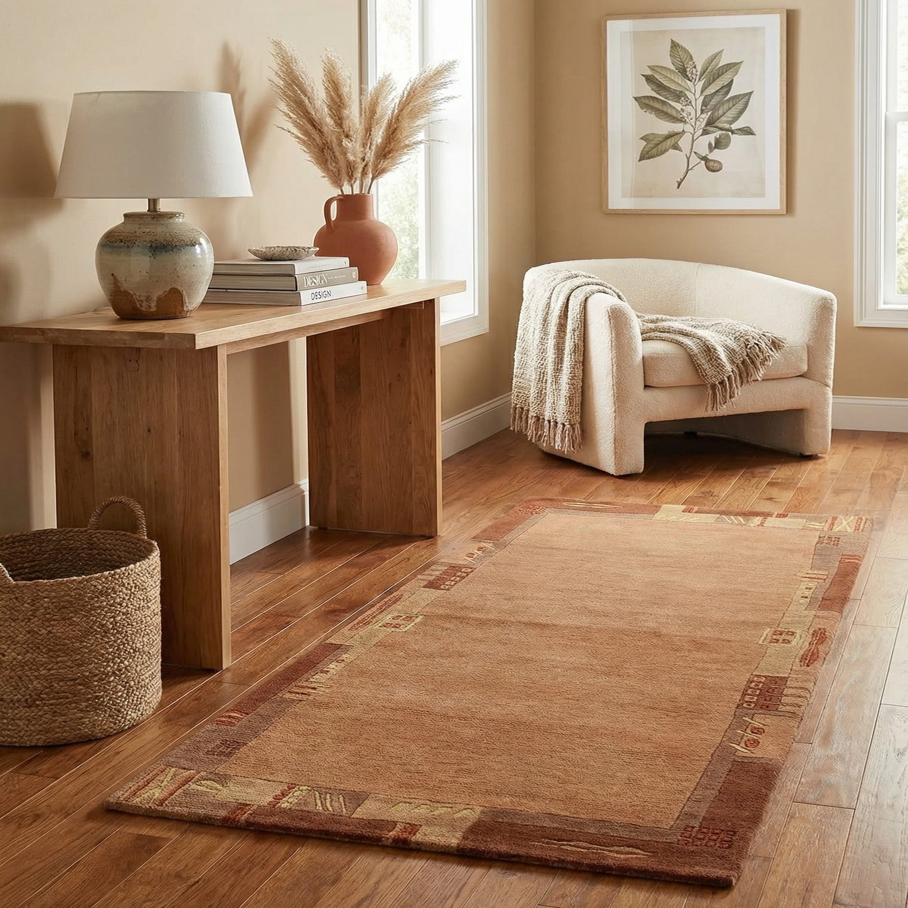 Primary color is Peach. Colors in this rug include: Peach, Beige, Burgundy, Red.