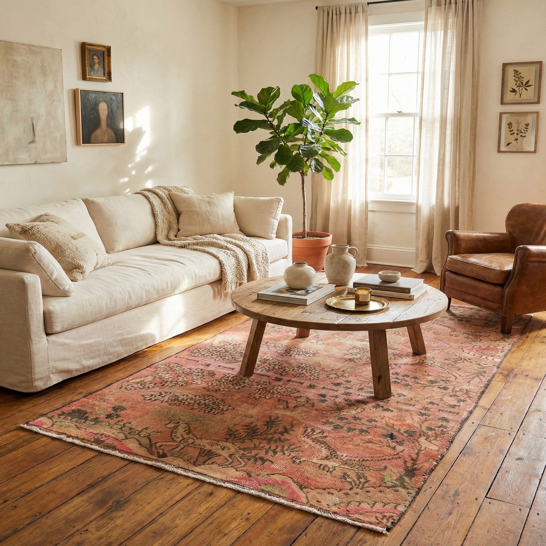 Primary color is Peach. Colors in this rug include: Peach, Beige, Brown, Pink.