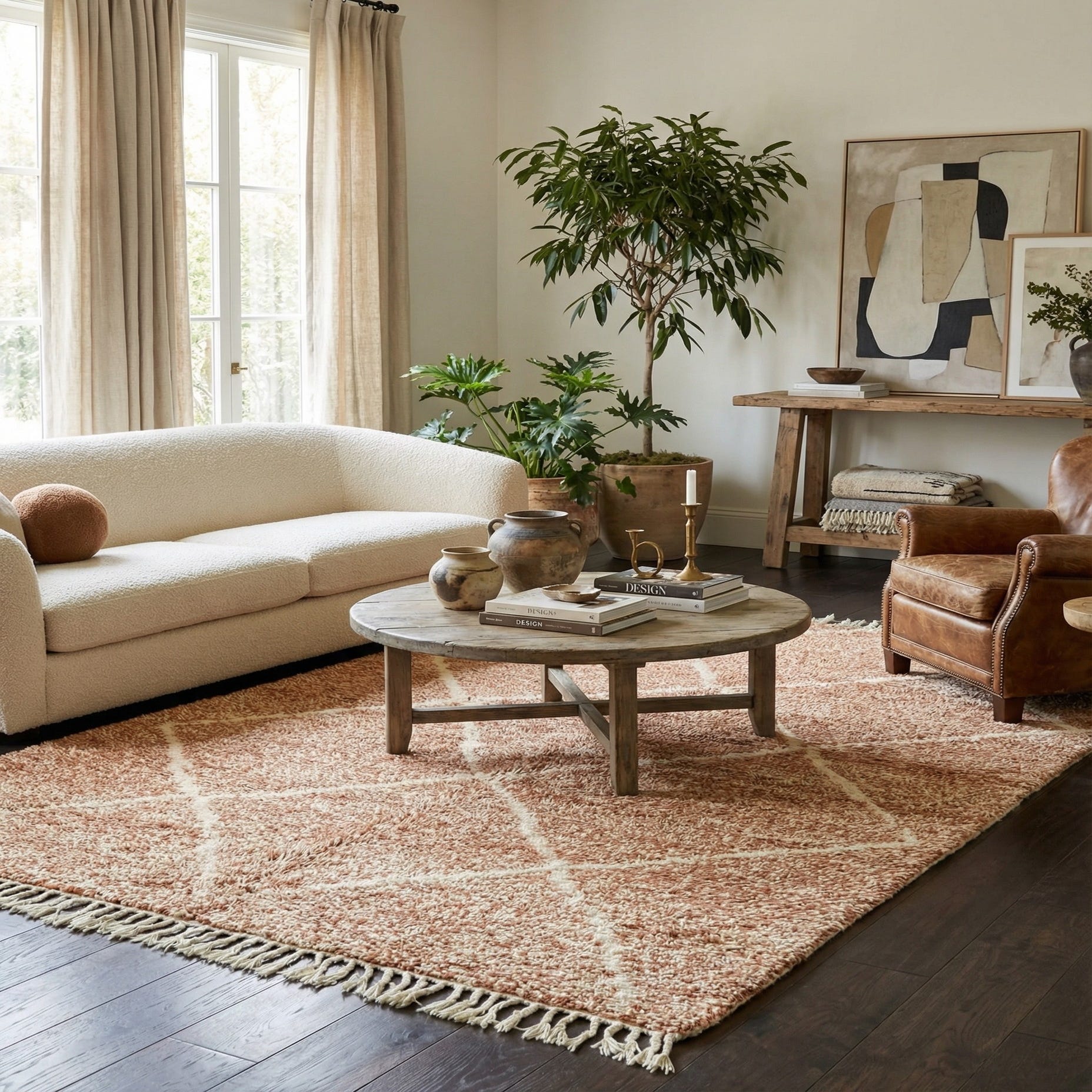 Primary color is Peach. Colors in this rug include: Peach, Ivory.