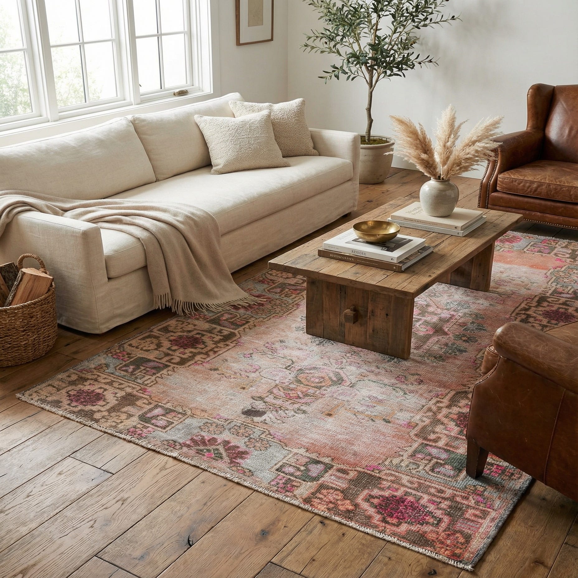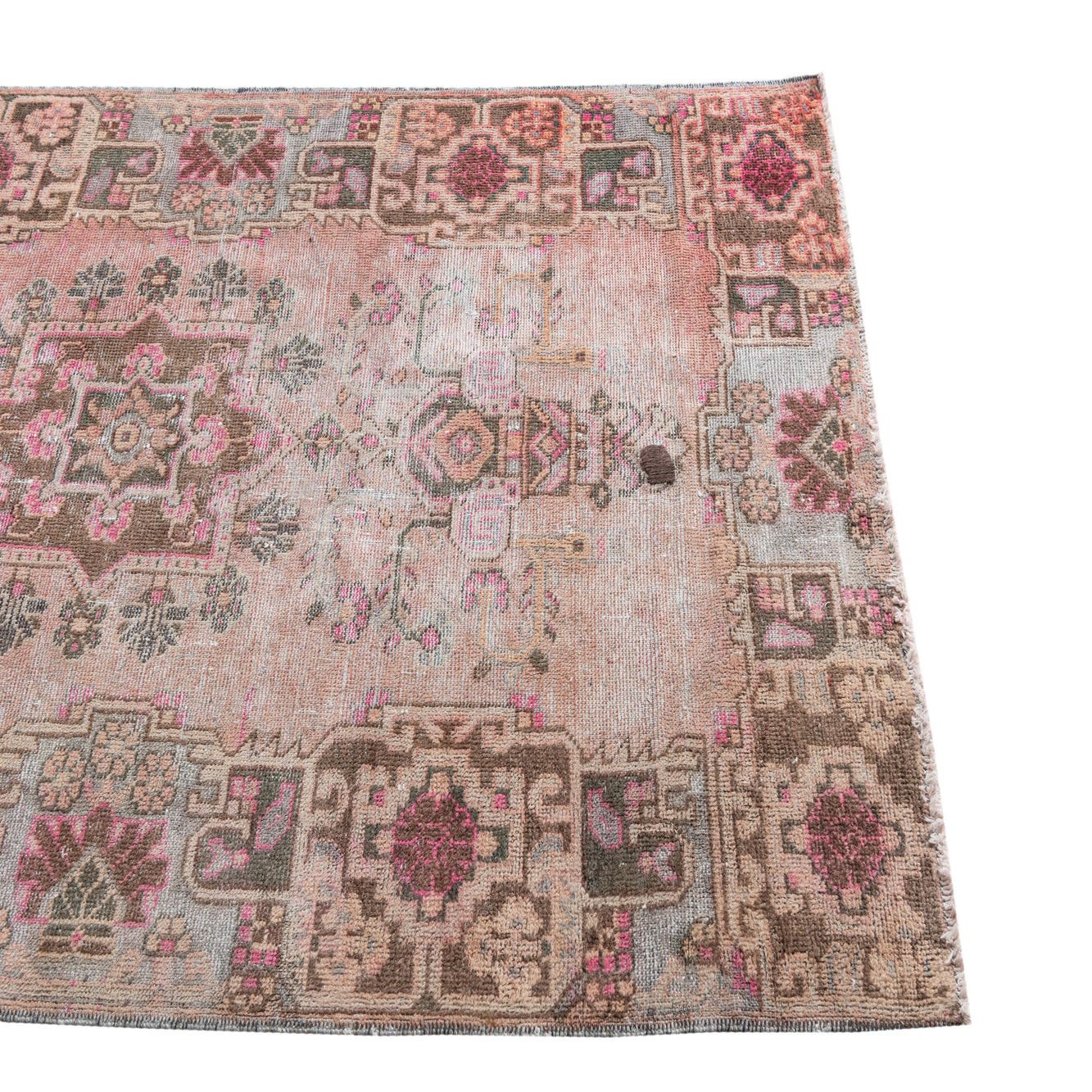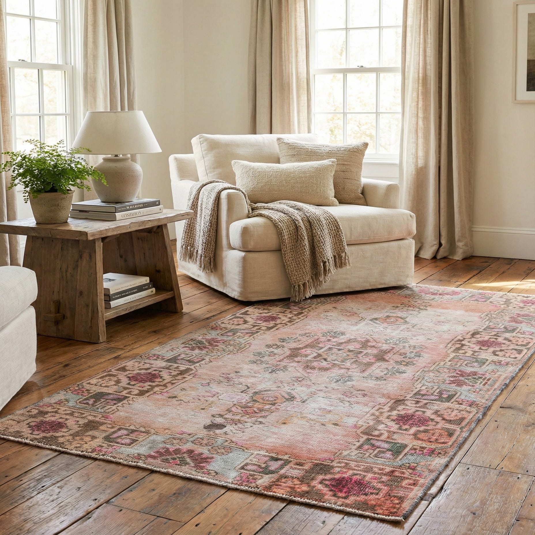 Primary color is Peach. Colors in this rug include: Peach, Brown, Pink, Burgundy, Ivory, Gray.