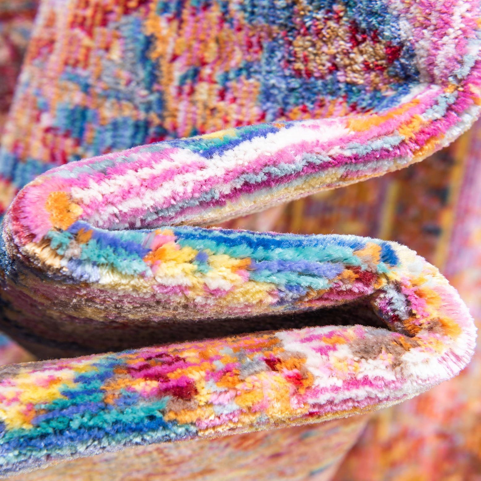 Primary color is Peach. Colors in this rug include: Peach, Blue, Brown, Gold, Green, Light Blue, Orange, Puce, Red.