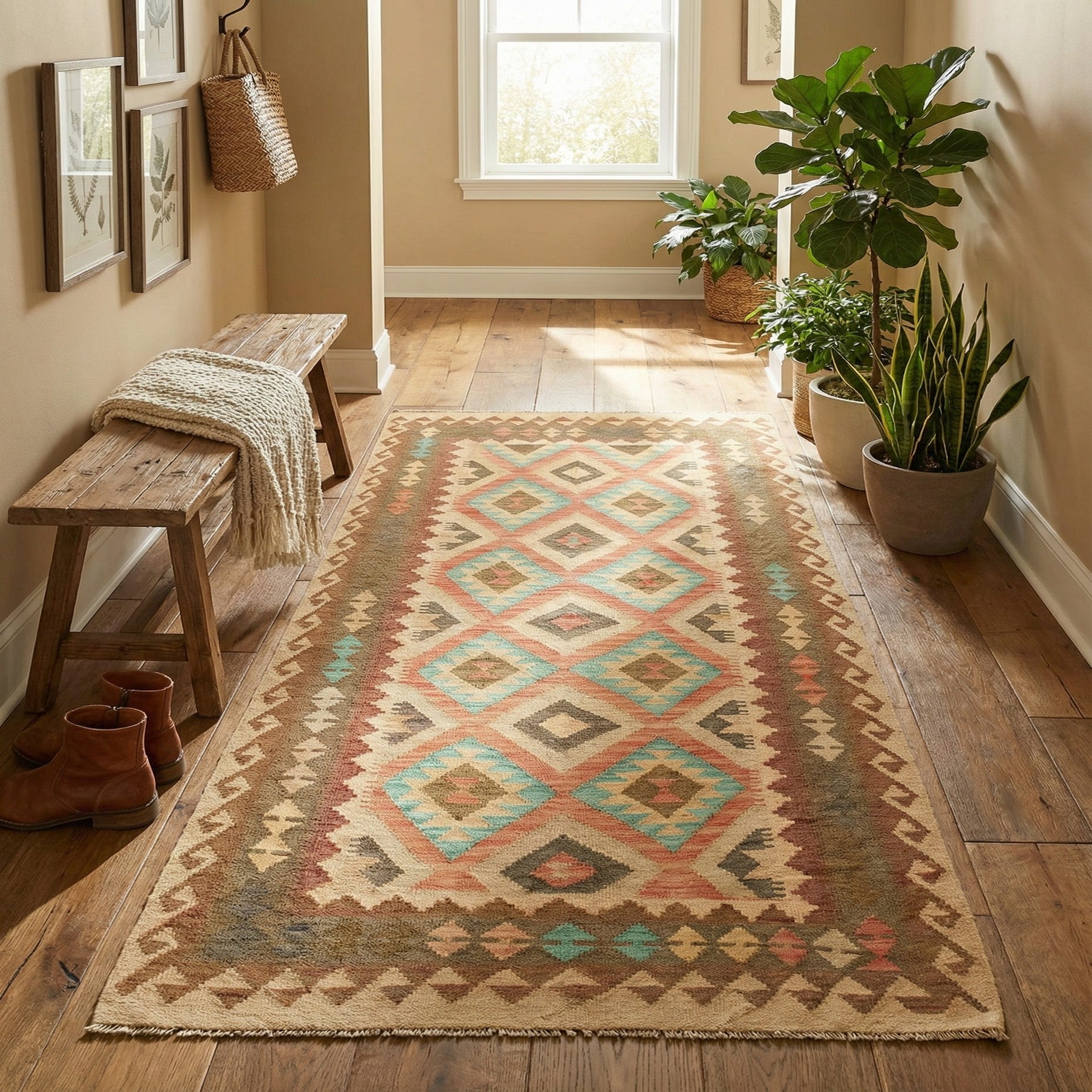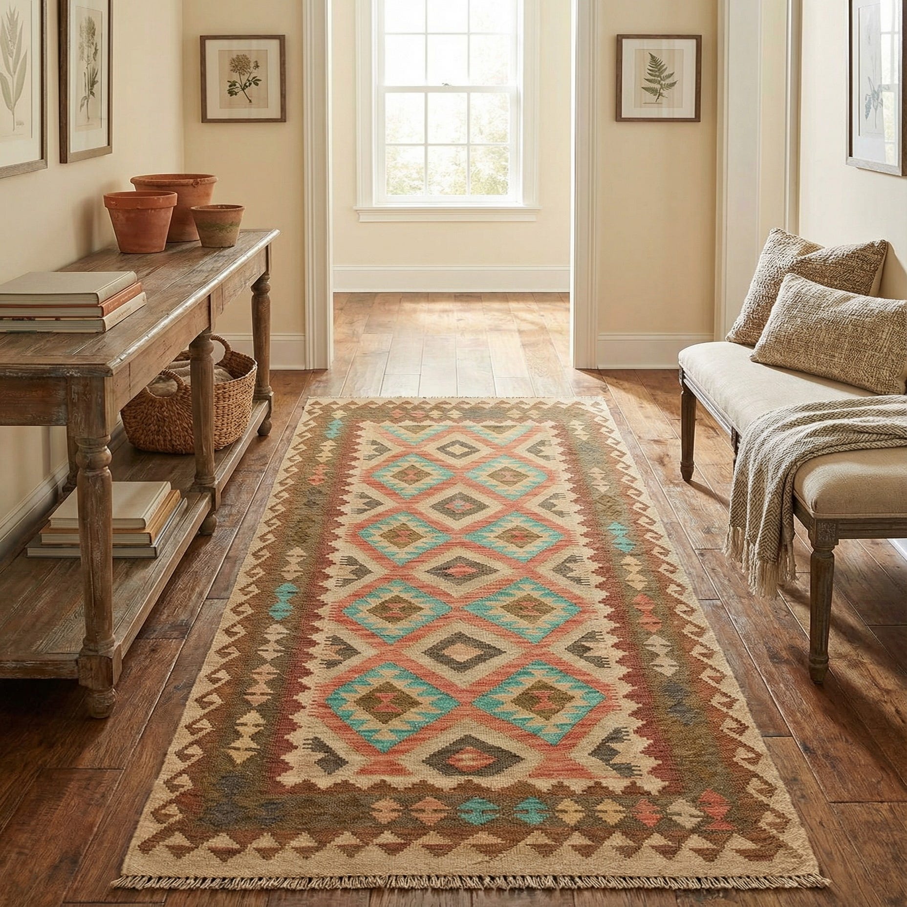 3' 4 x 6' 6 Hand Woven Kilim Maymana Wool Runner Rug