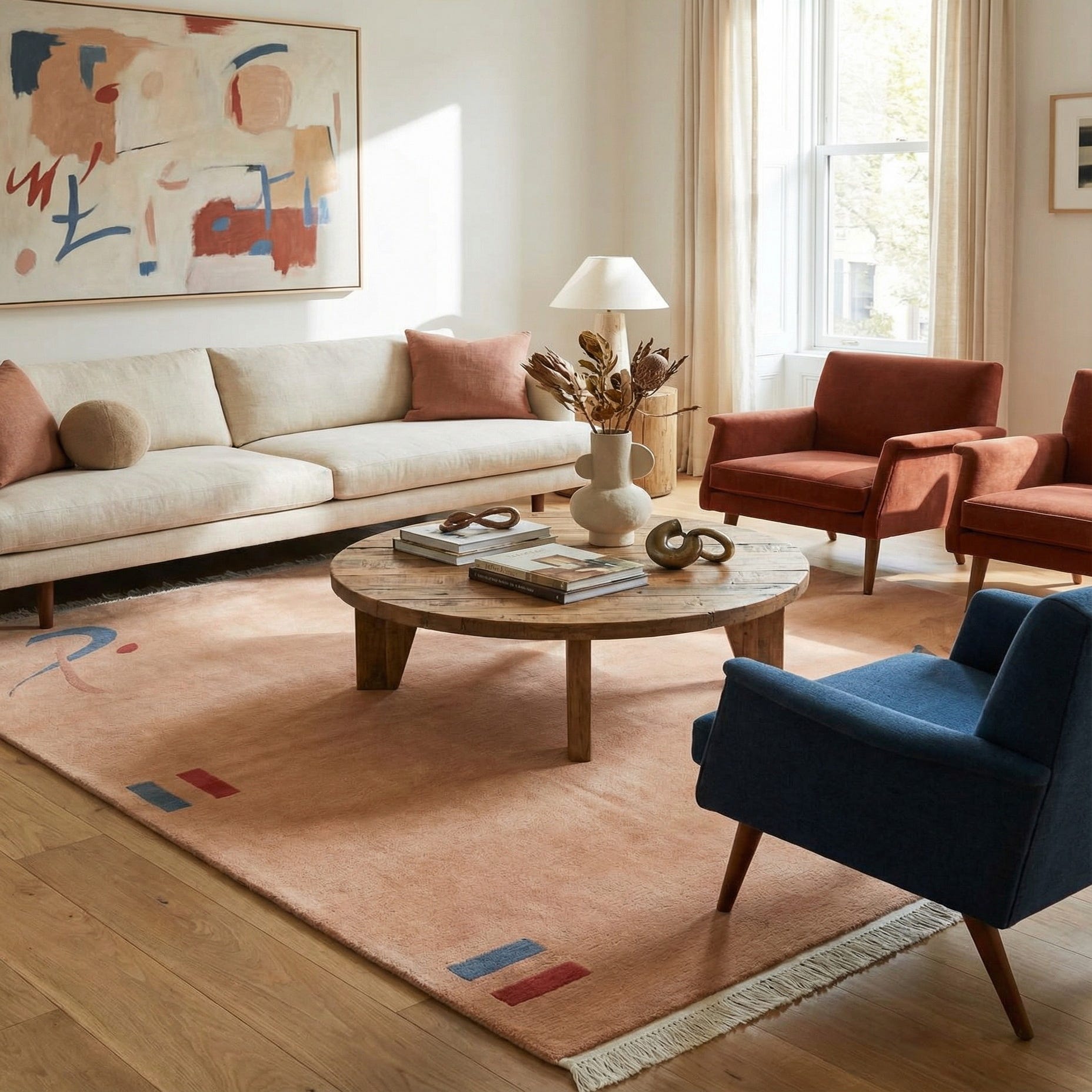 Primary color is Peach. Colors in this rug include: Peach, Gray, Terracotta.