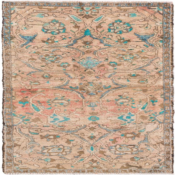 Primary color is Peach. Colors in this rug include: Peach, Beige, Blue, Brown.