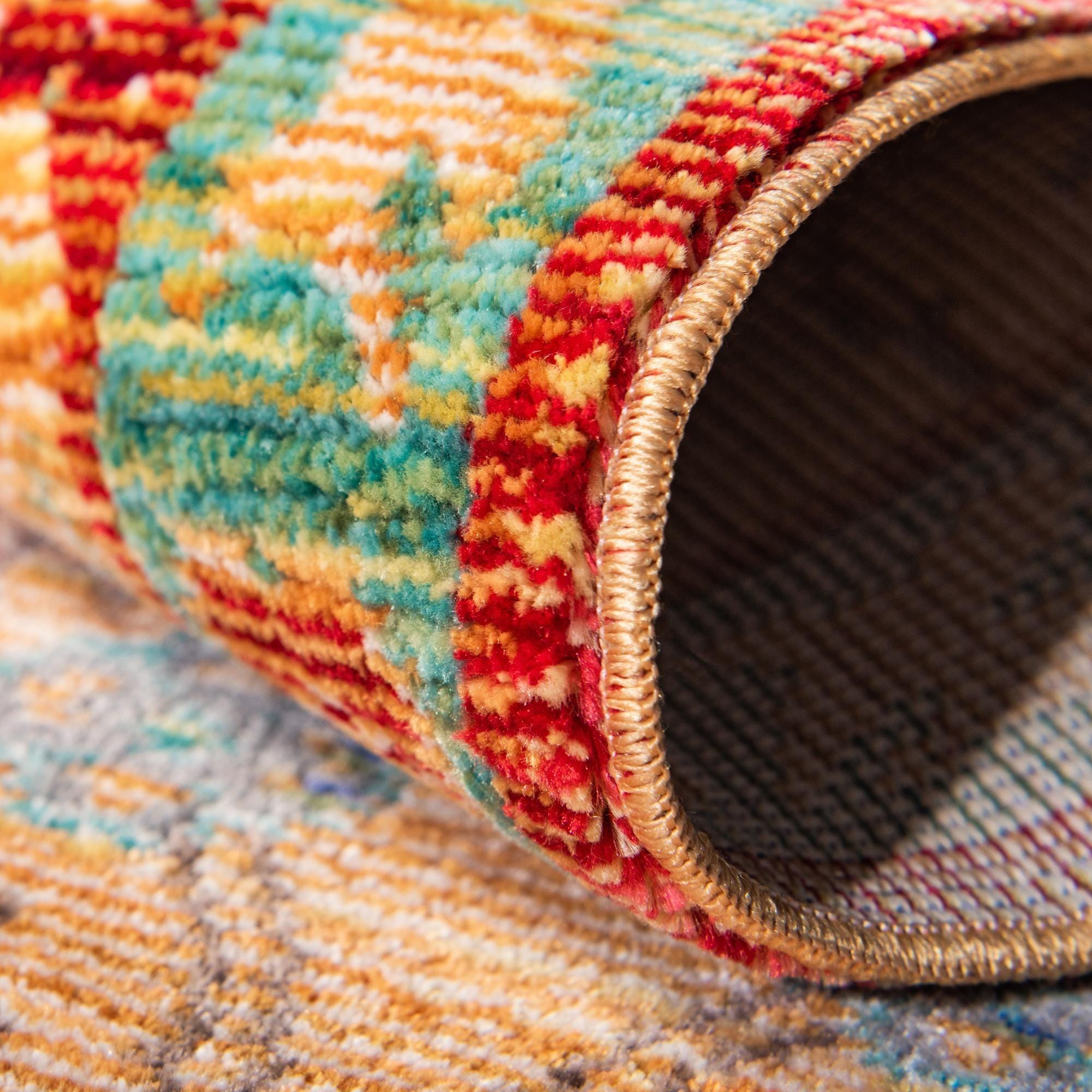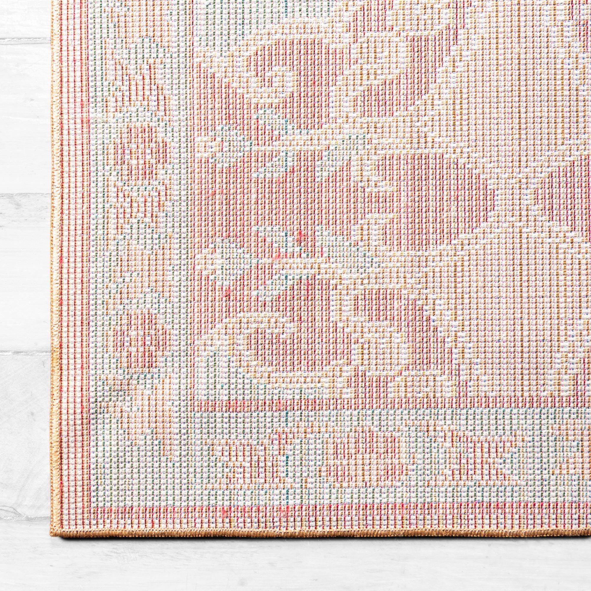 Primary color is Peach. Colors in this rug include: Peach, Beige, Blue, Burgundy, Gray, Light Blue, Light Brown, Orange, Puce, Yellow.