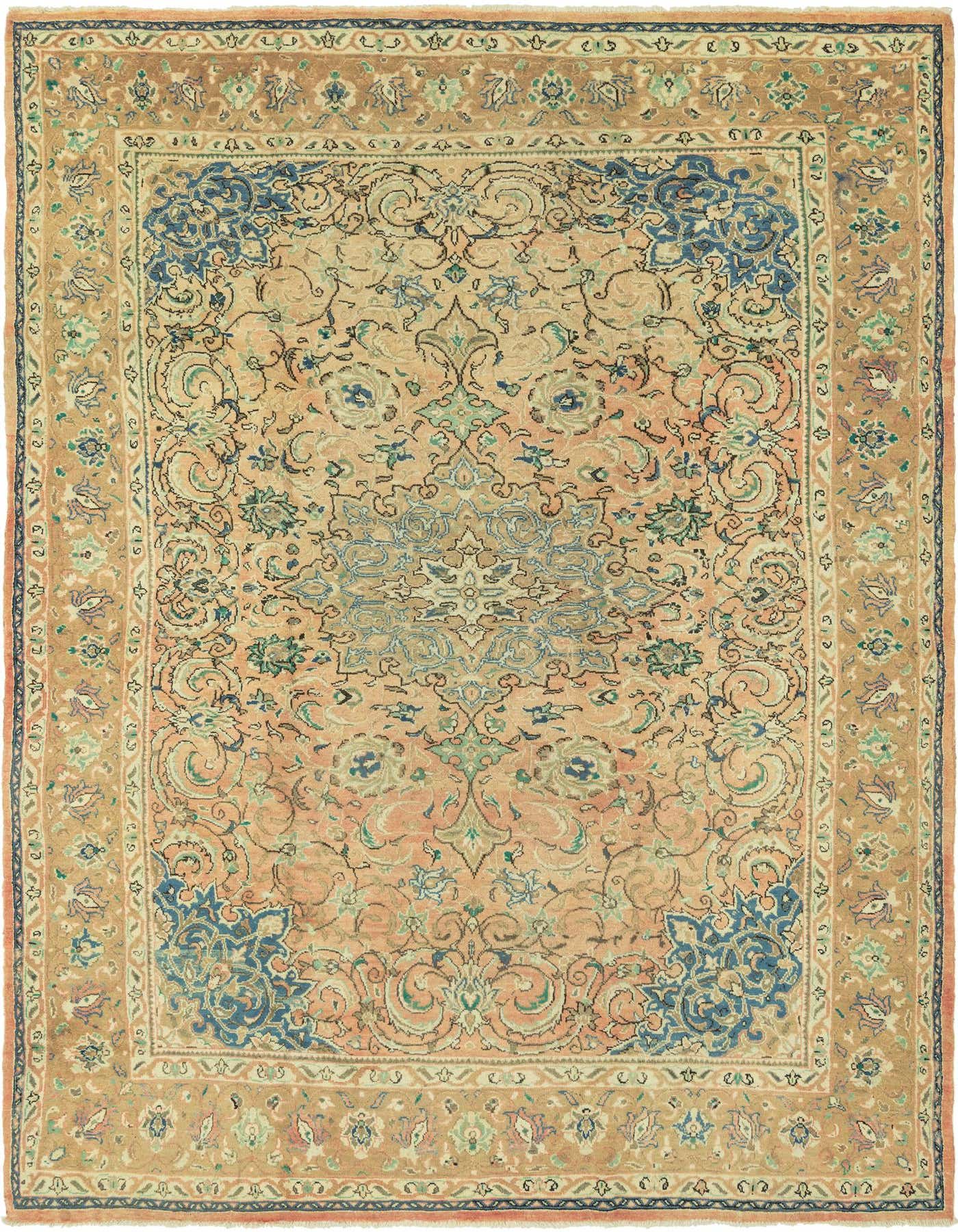 Primary color is Peach. Colors in this rug include: Peach, Beige, Blue, Brown, Green, Ivory, Light Green.