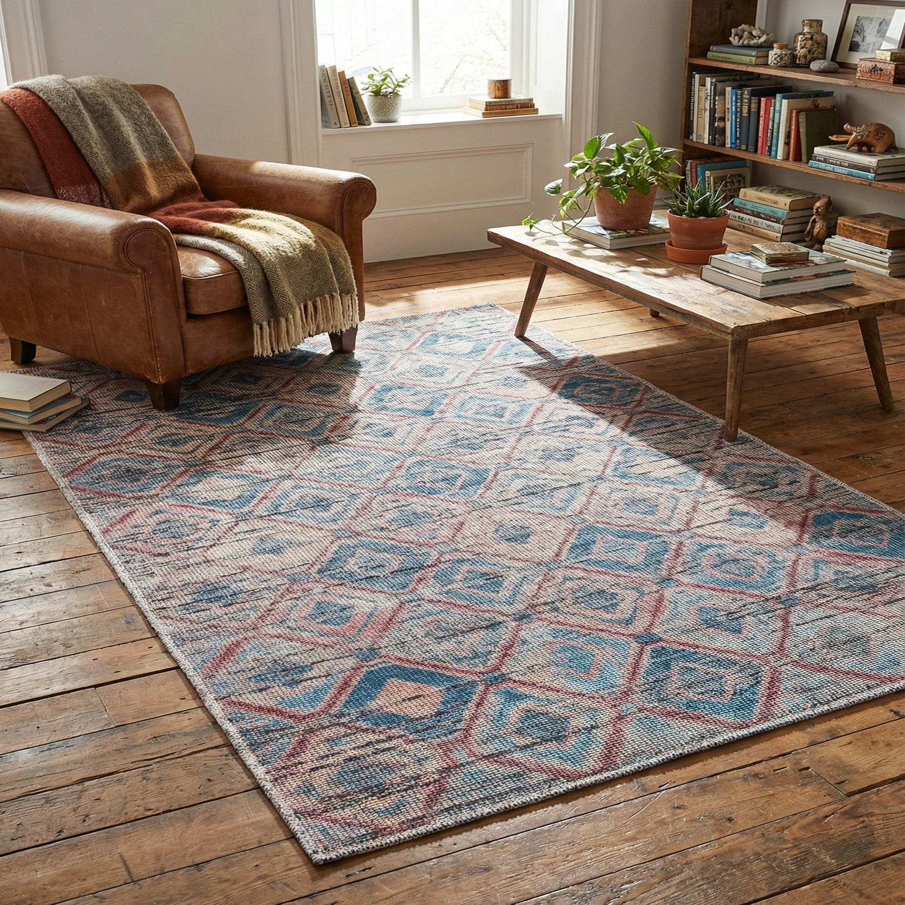 Primary color is Peach and Blue. Colors in this rug include: Peach and Blue, Brown, Red, Navy Blue, Light Blue.