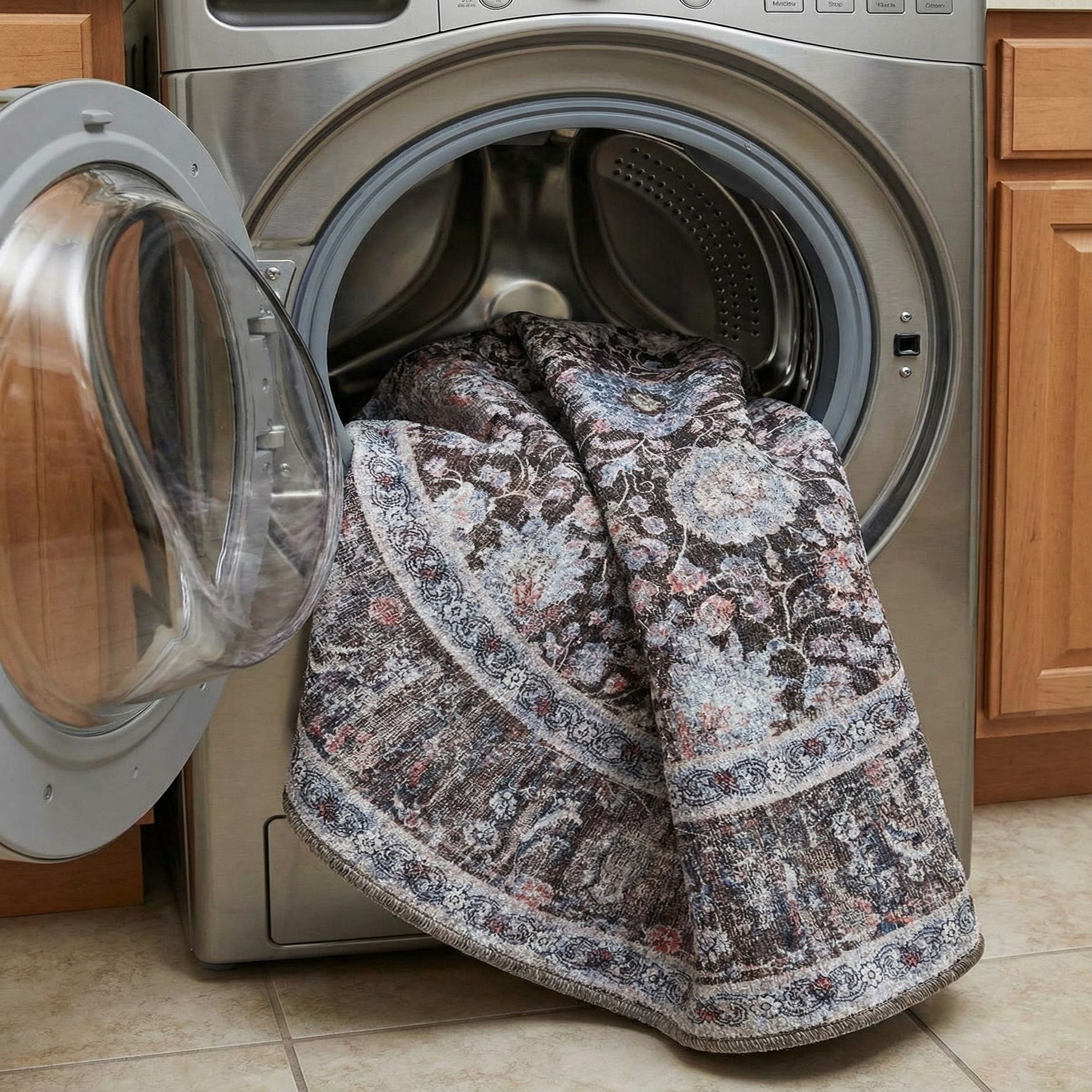 Primary color is Pecan Brown. Colors in this rug include: Pecan Brown, Beige, Blue, Ivory, Navy Blue, Red.