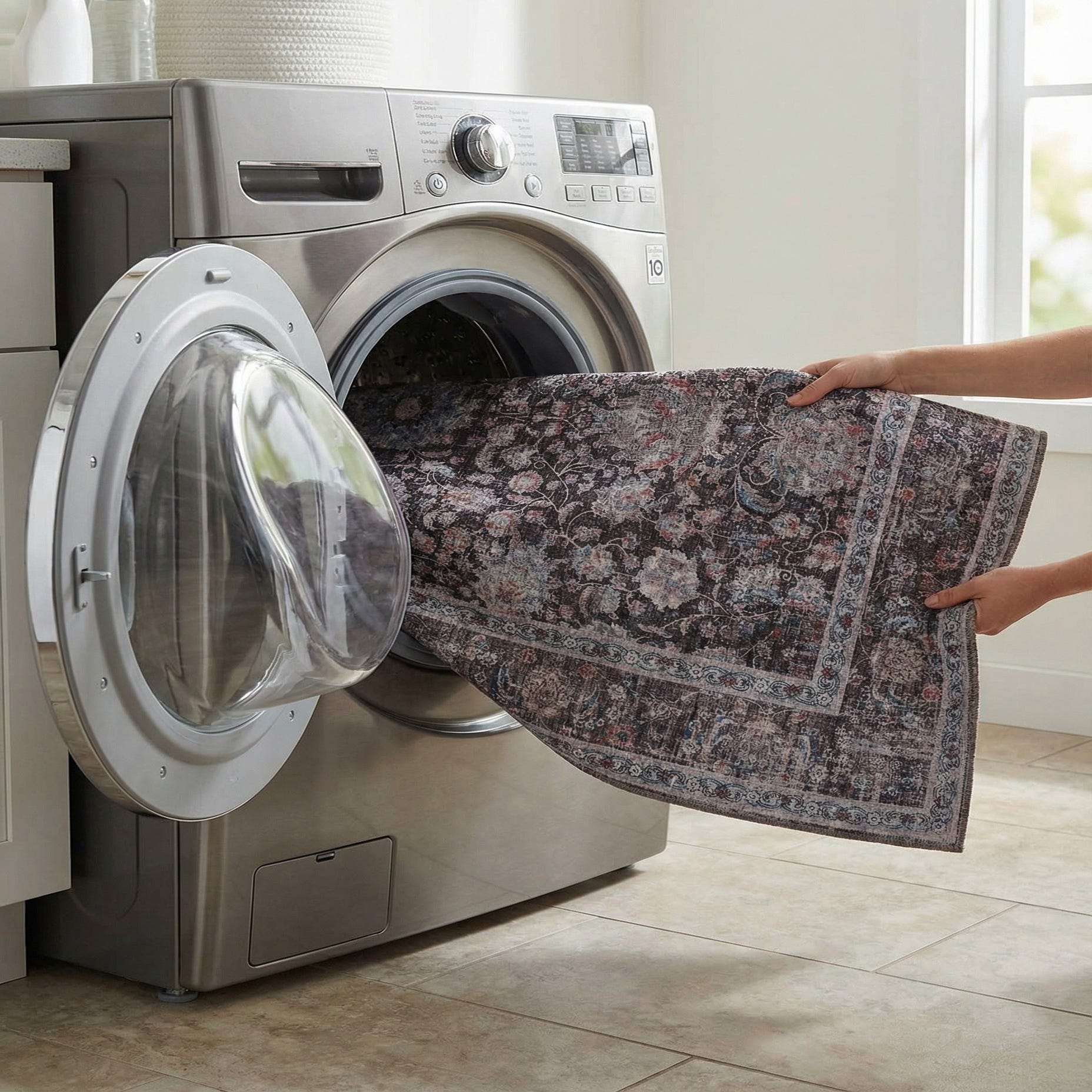 Primary color is Pecan Brown. Colors in this rug include: Pecan Brown, Beige, Blue, Ivory, Navy Blue, Red.