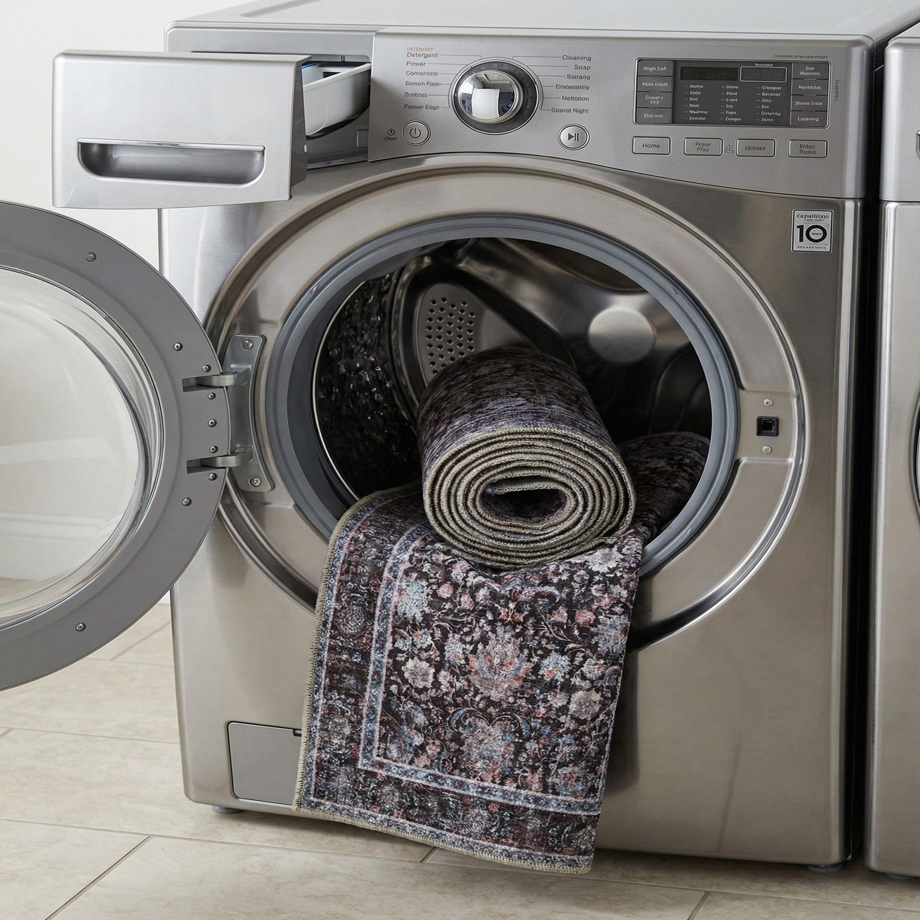 Primary color is Pecan Brown. Colors in this rug include: Pecan Brown, Beige, Blue, Ivory, Navy Blue, Red.