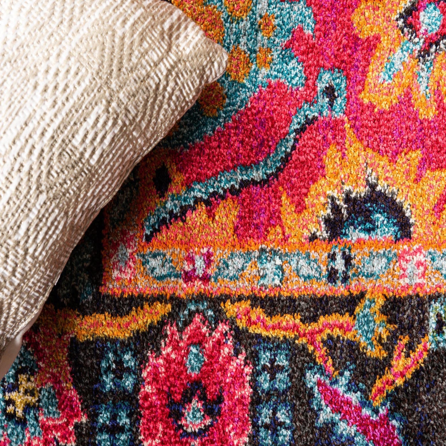 Primary color is Pink. Colors in this rug include: Pink, Beige, Brown, Light Blue, Light Green, Red, Blue, Orange, Yellow.