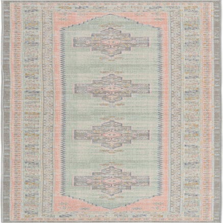 Primary color is Pink. Colors in this rug include: Pink, Blue, Gold, Gray, Light Blue, Light Green.