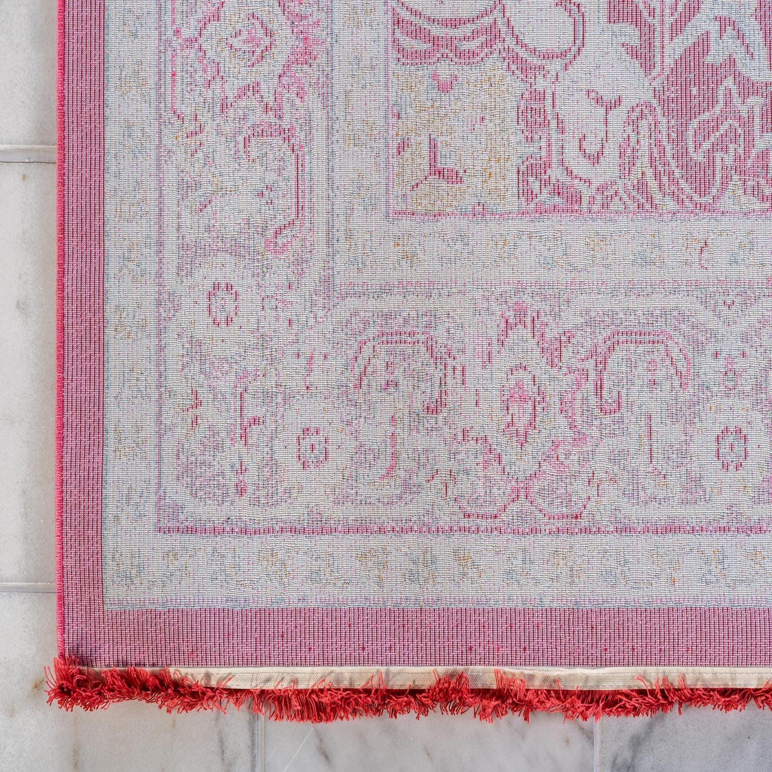 Primary color is Pink. Colors in this rug include: Pink, Beige, Gold, Ivory, Olive, Light Blue.