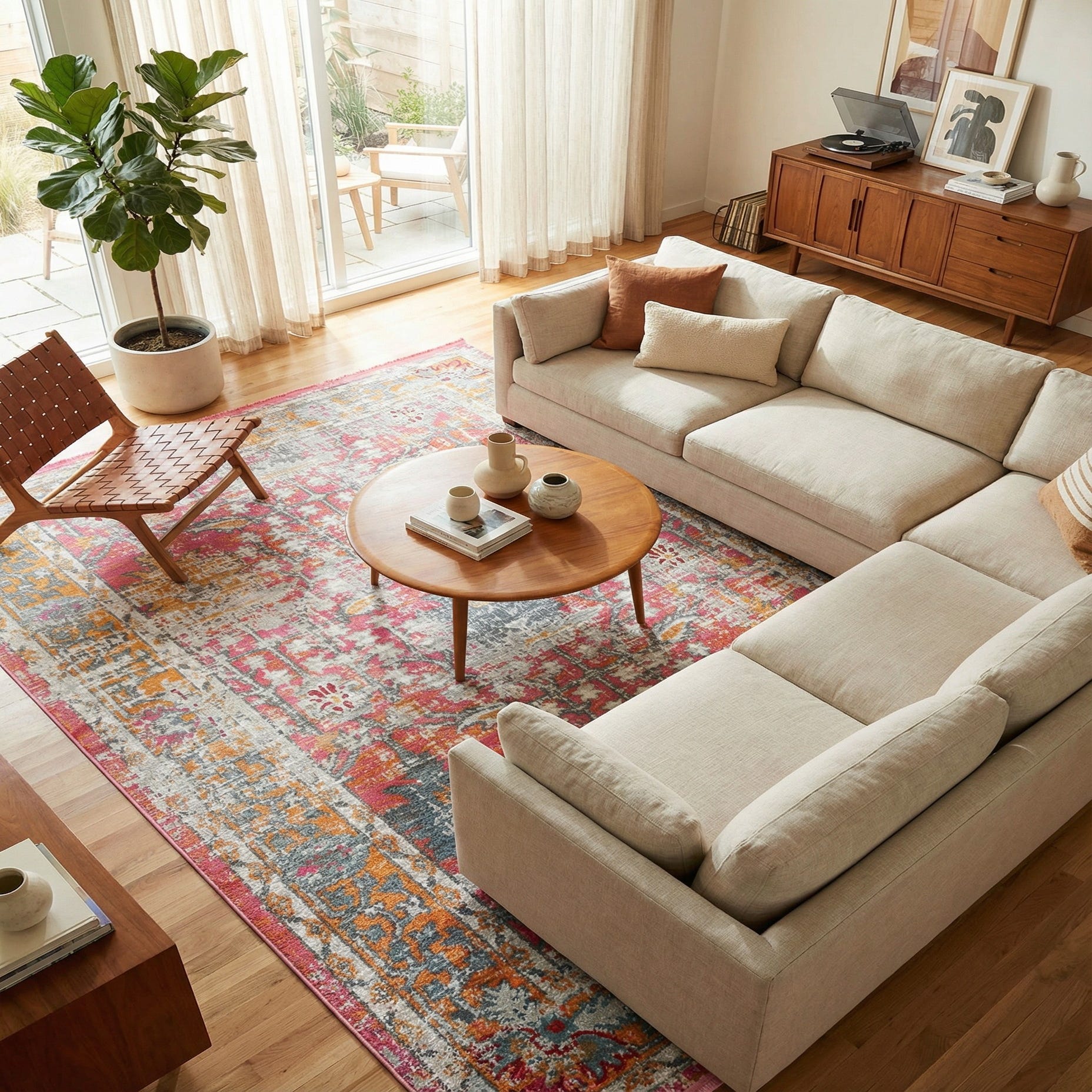 Primary color is Pink. Colors in this rug include: Pink, Blue, Gray, Green, Ivory, Red, Yellow, Orange.