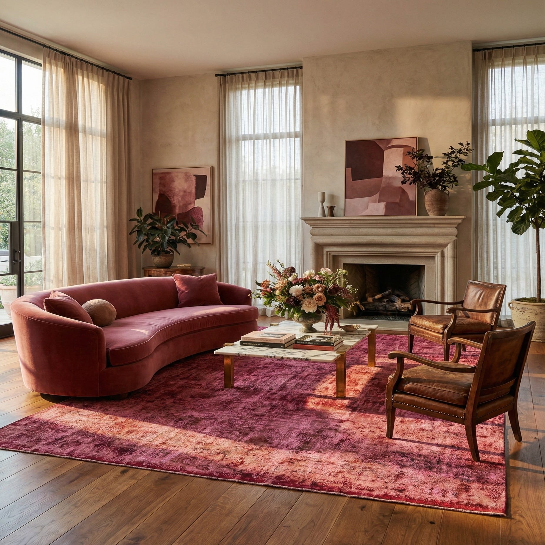 Primary color is Pink. Colors in this rug include: Pink, Red, Brown.