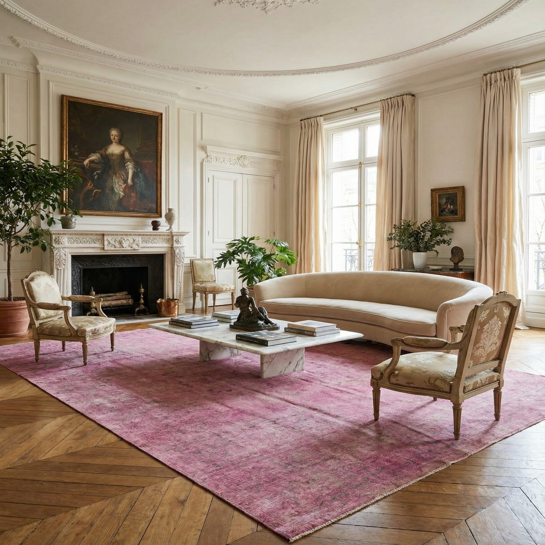 Primary color is Pink. Colors in this rug include: Pink, Brown, Ivory, Blue.