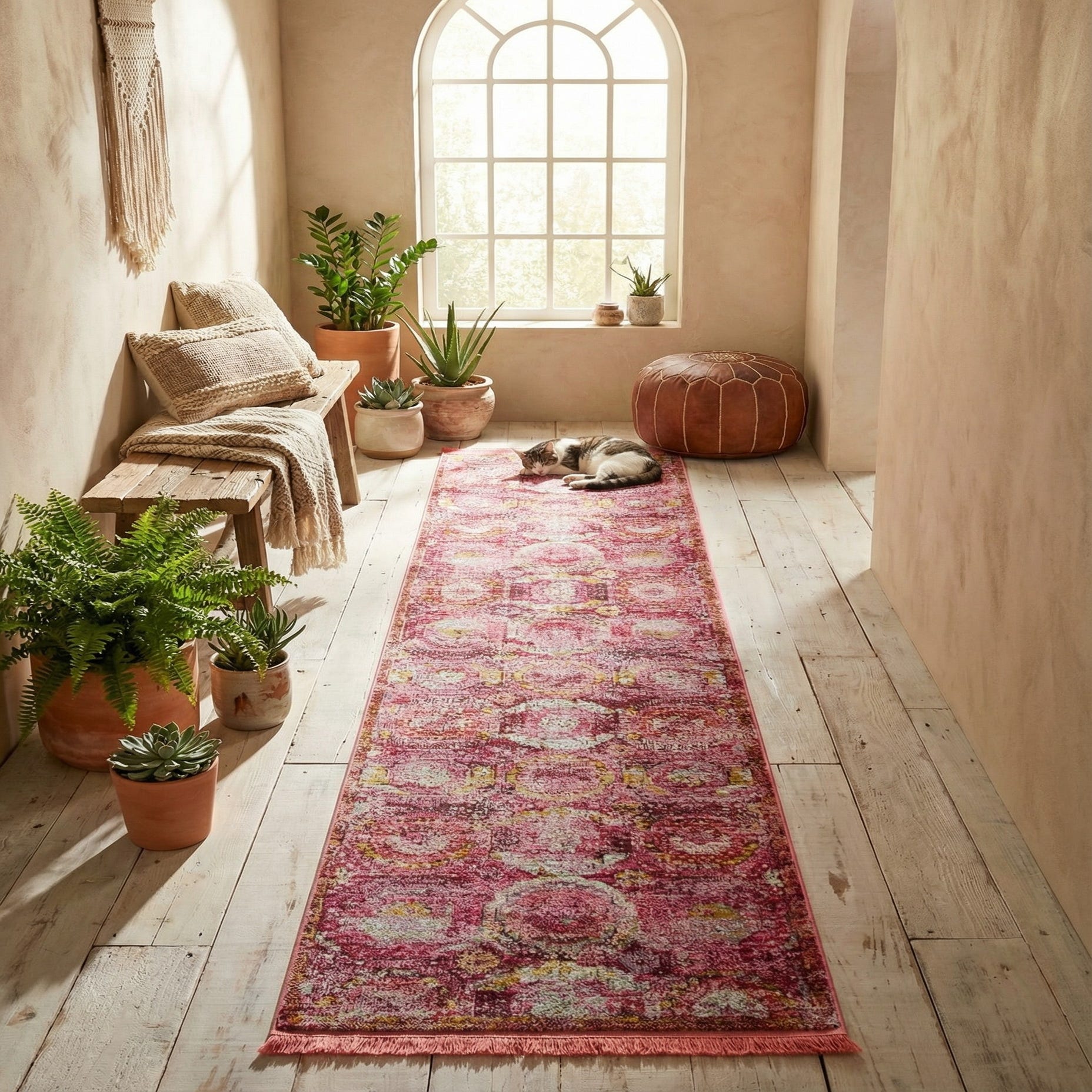 Primary color is Pink. Colors in this rug include: Pink, Burgundy, Ivory, Olive, Orange, Red, Purple.