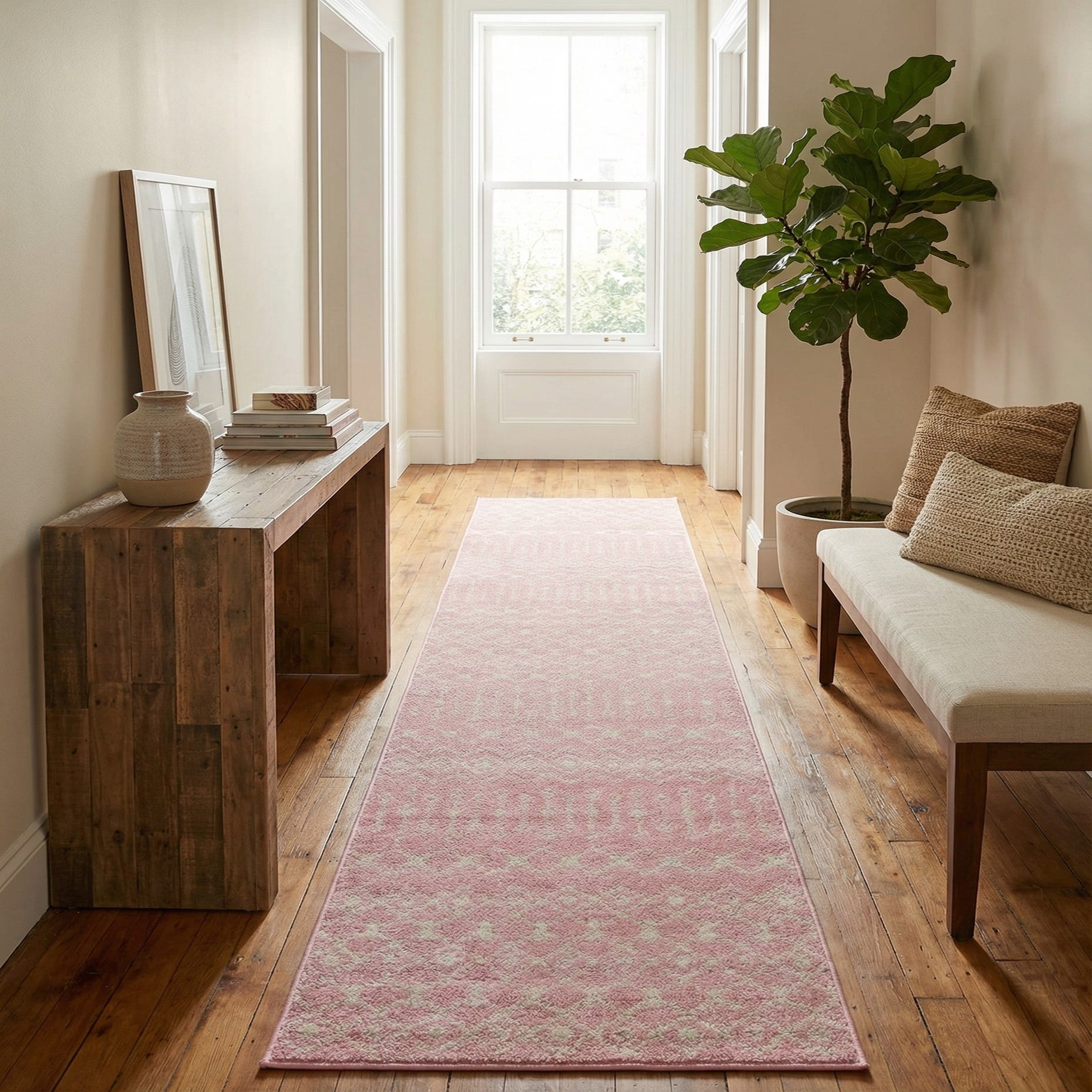 Primary color is Pink. Colors in this rug include: Pink, Ivory.