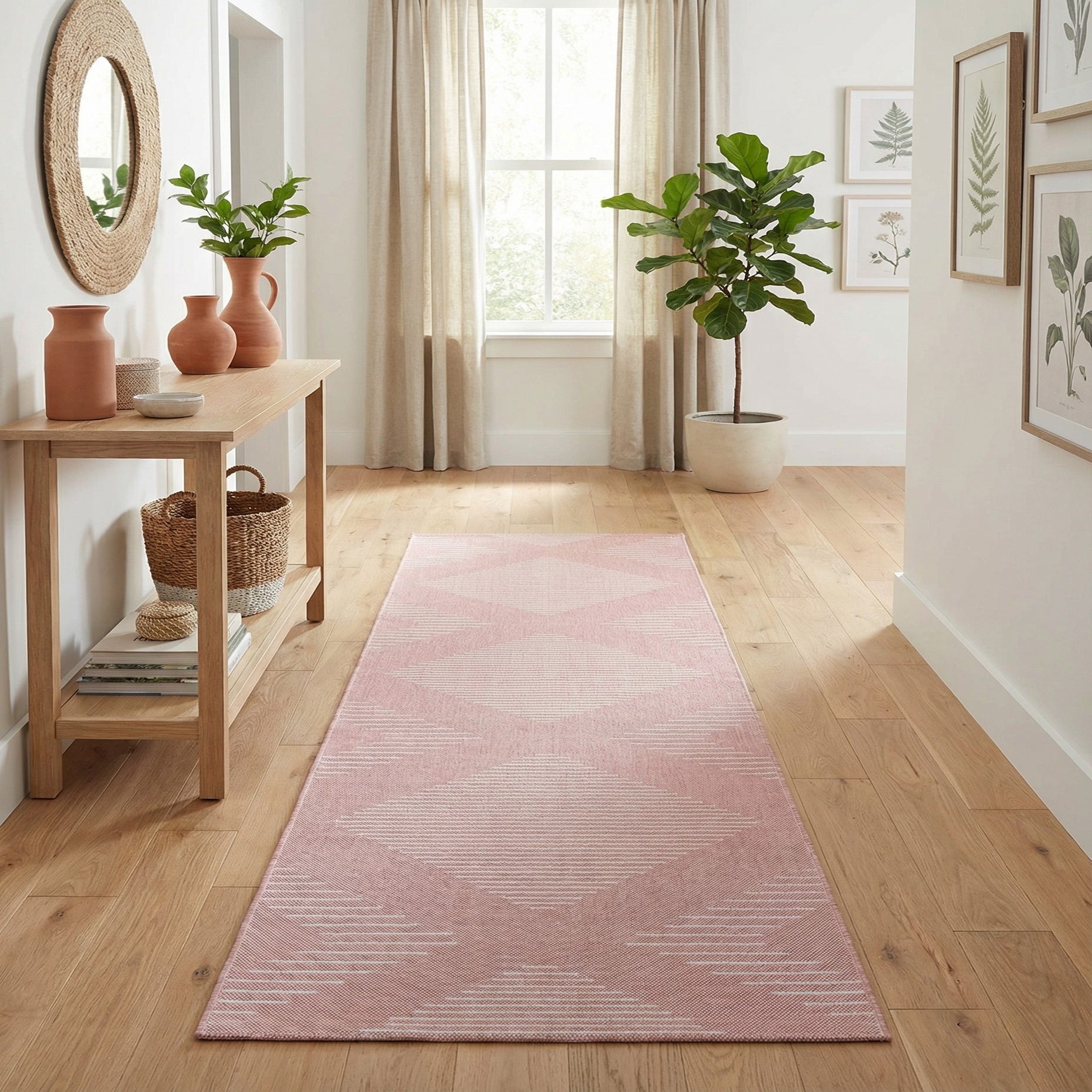 Primary color is Pink. Colors in this rug include: Pink, Ivory.
