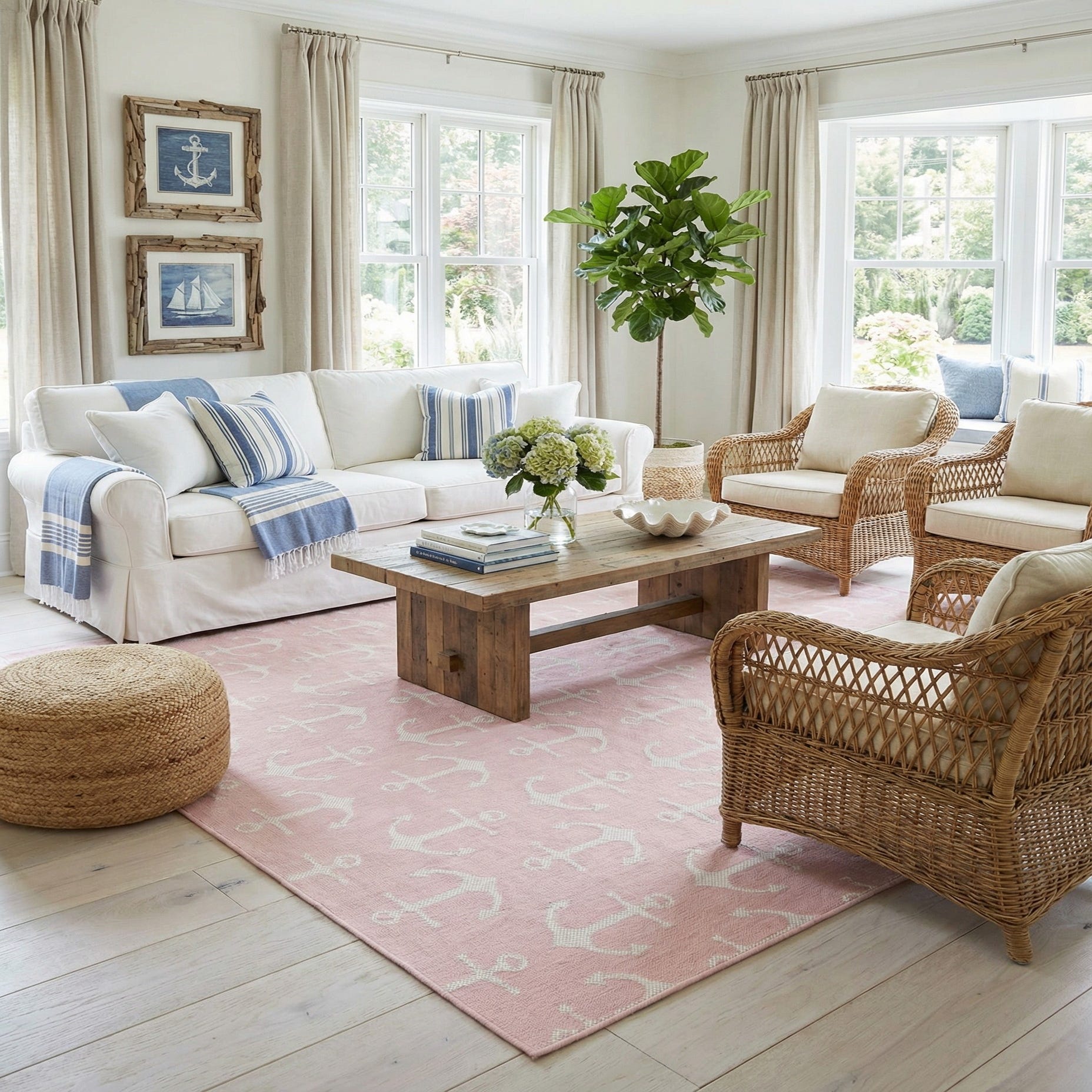 Primary color is Pink. Colors in this rug include: Pink, Ivory.