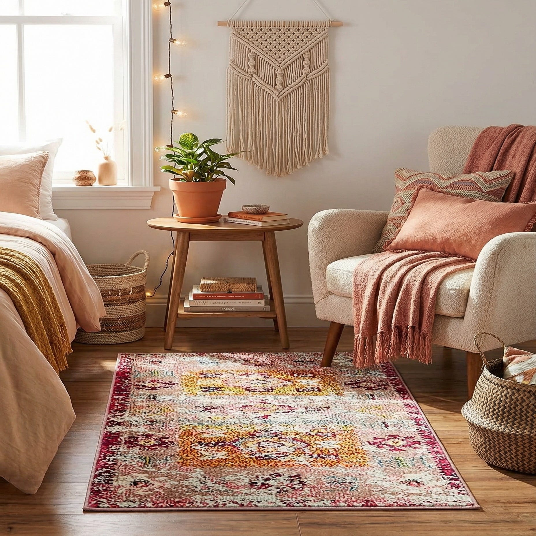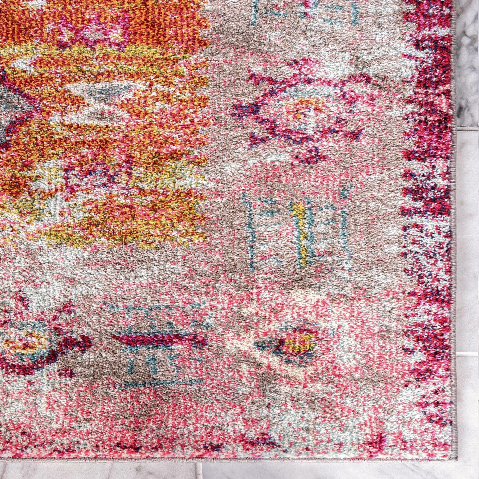 Primary color is Pink. Colors in this rug include: Pink, Beige, Blue, Gold, Green, Orange, Purple, Red.