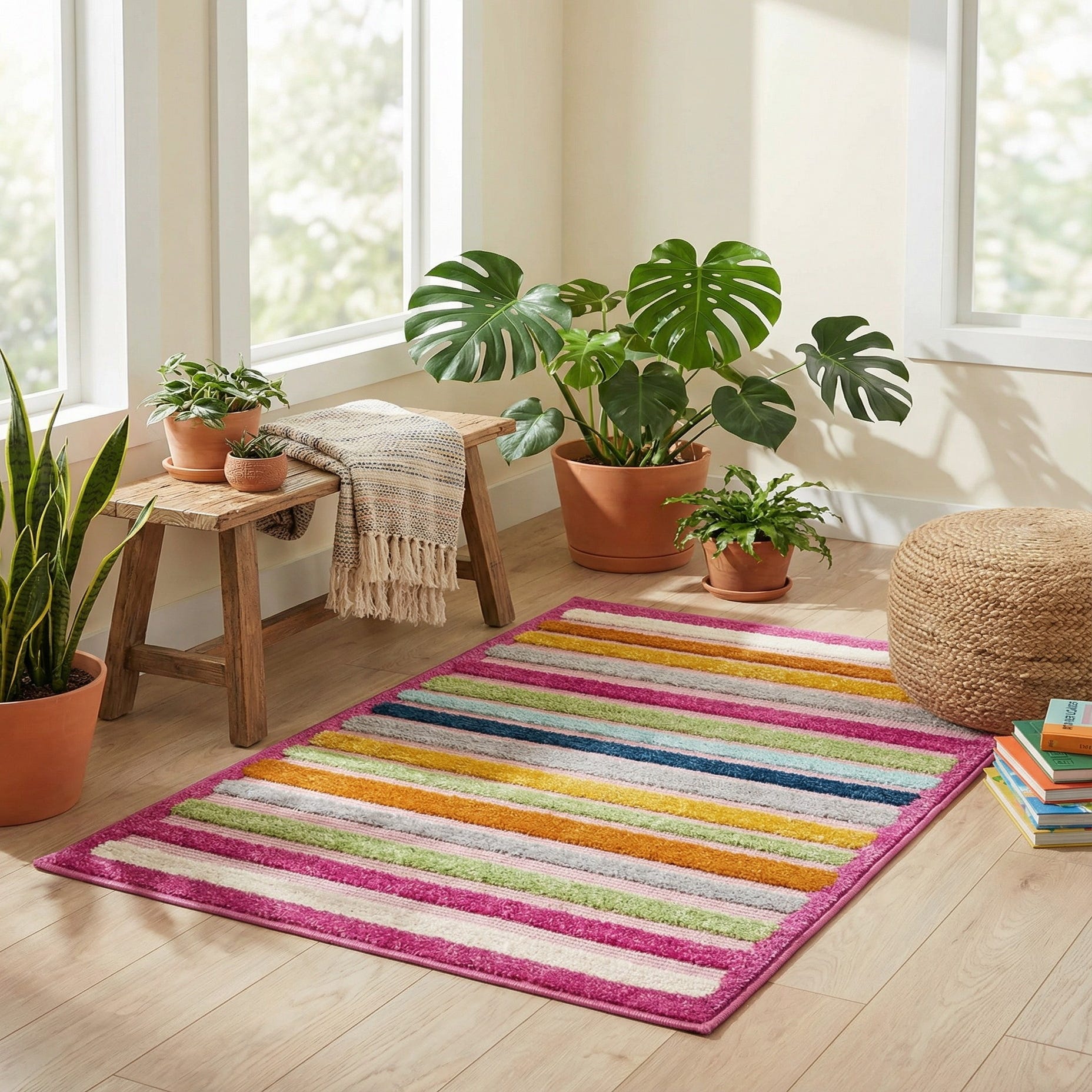 Primary color is Pink. Colors in this rug include: Pink, Gold, Gray, Green, Ivory, Light Blue, Navy Blue, Orange.