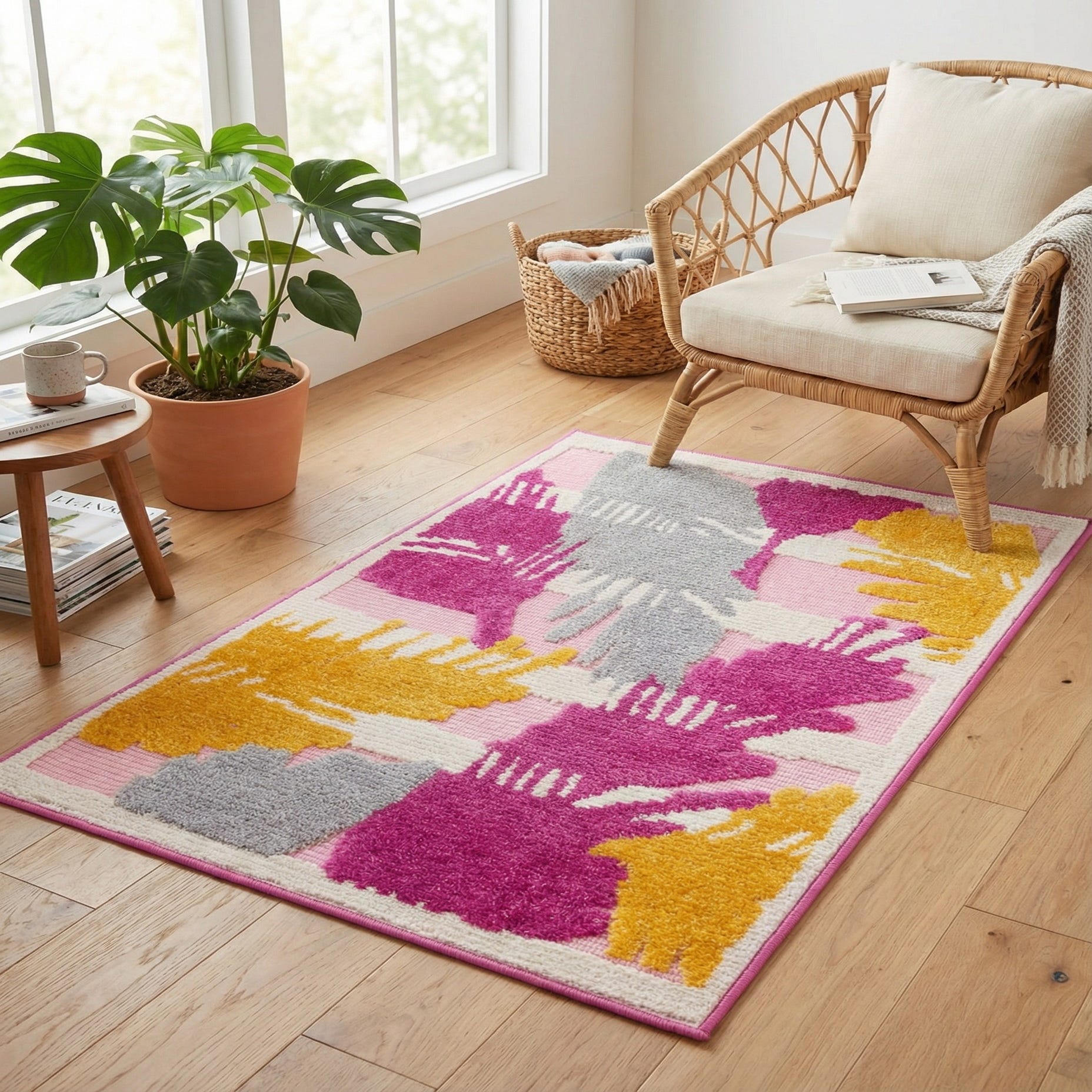 Primary color is Pink. Colors in this rug include: Pink, Gray, Ivory, Orange.