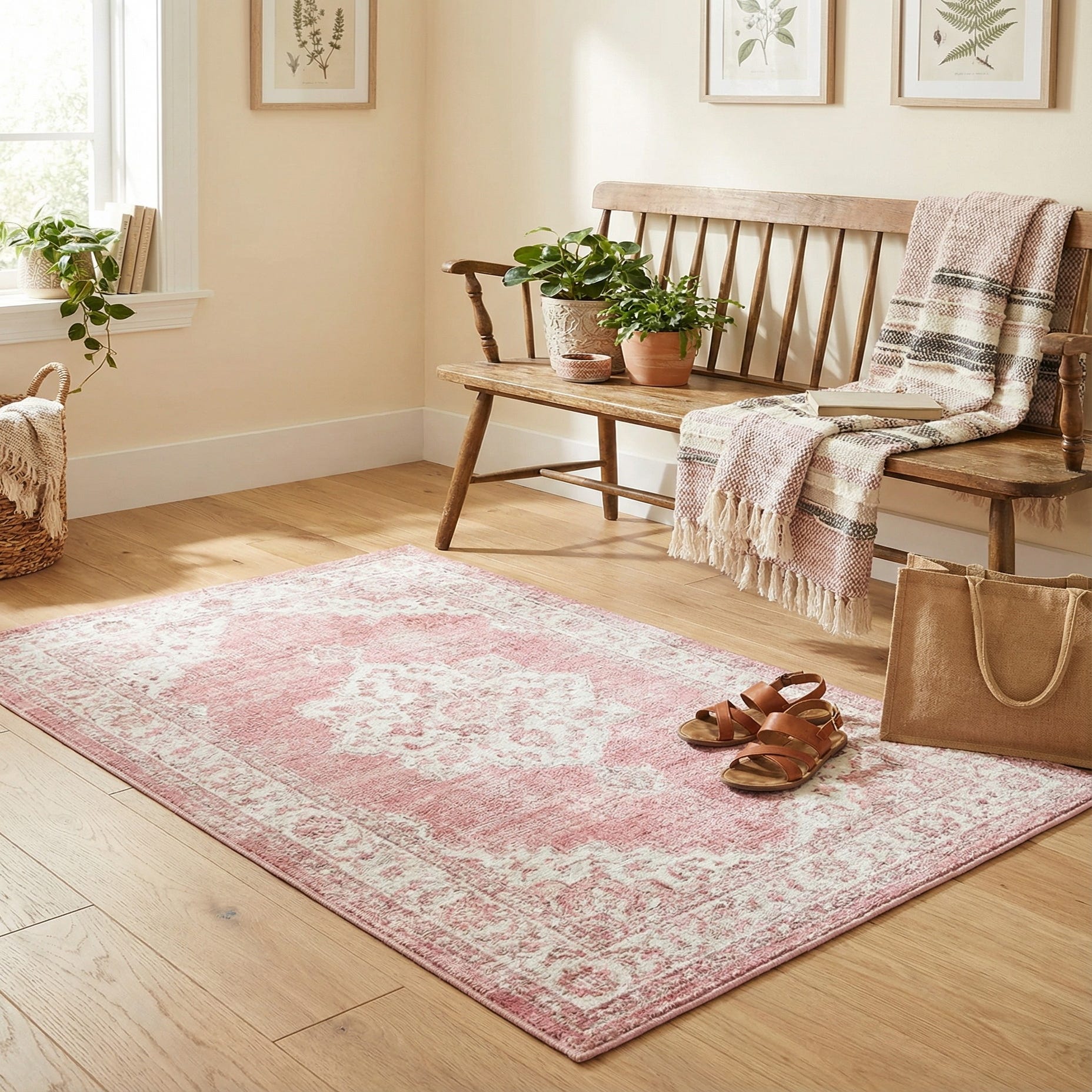 Primary color is Pink. Colors in this rug include: Pink, Ivory.