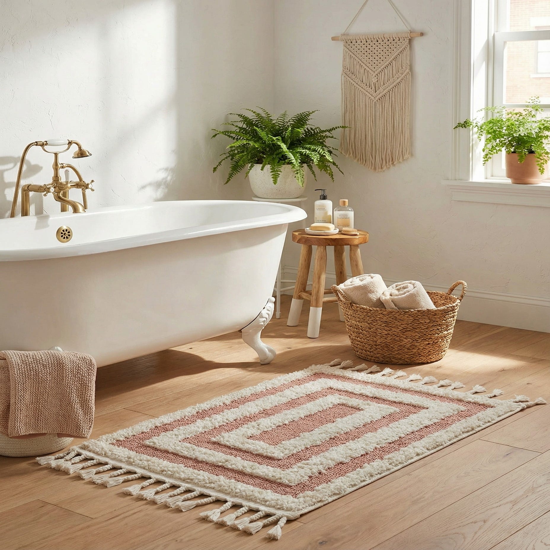 Primary color is Pink. Colors in this rug include: Pink, Ivory.