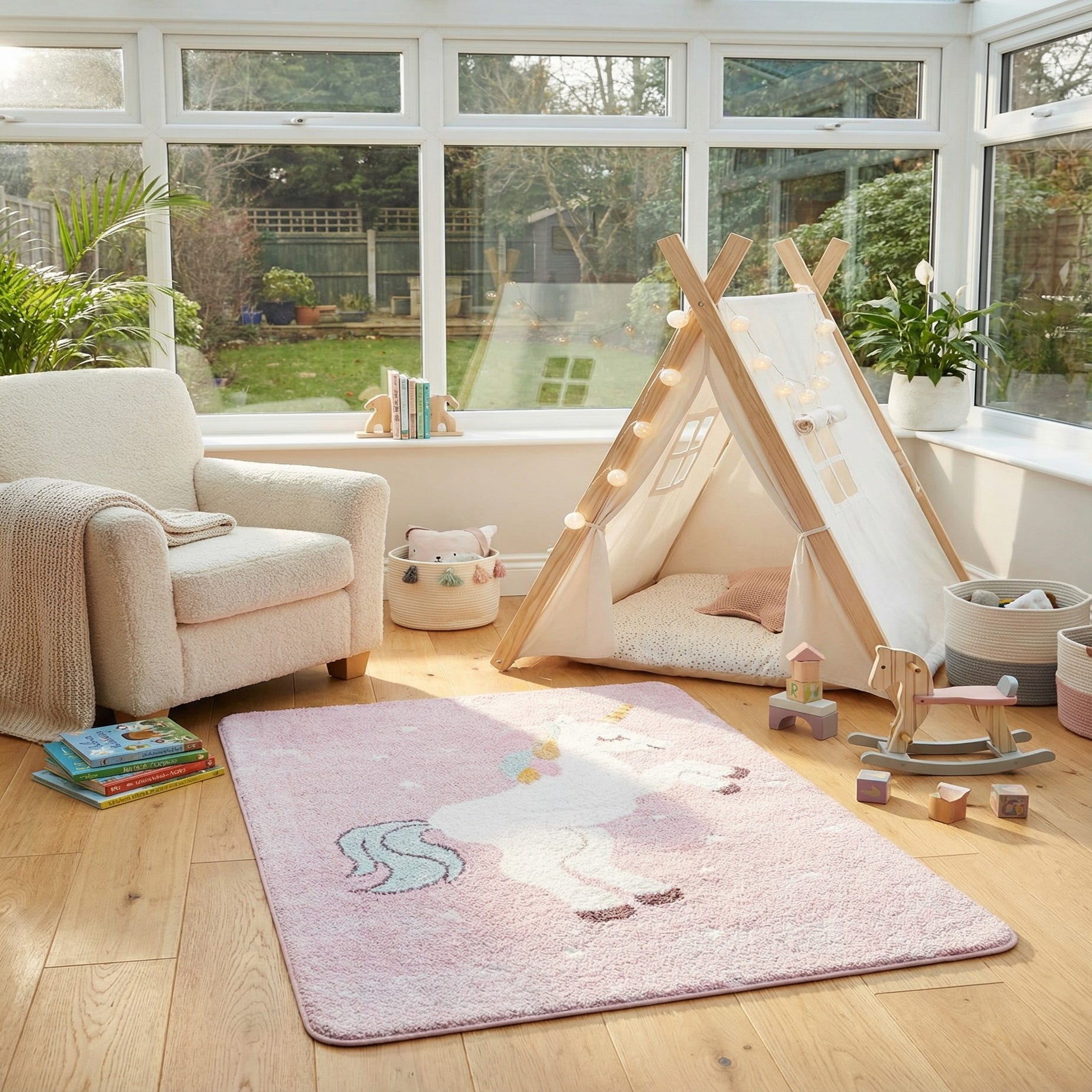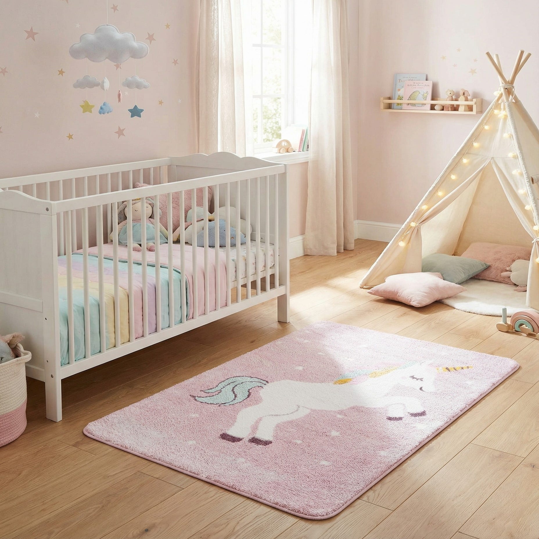 Primary color is Pink. Colors in this rug include: Pink, Black, Ivory, Yellow, Light Blue.