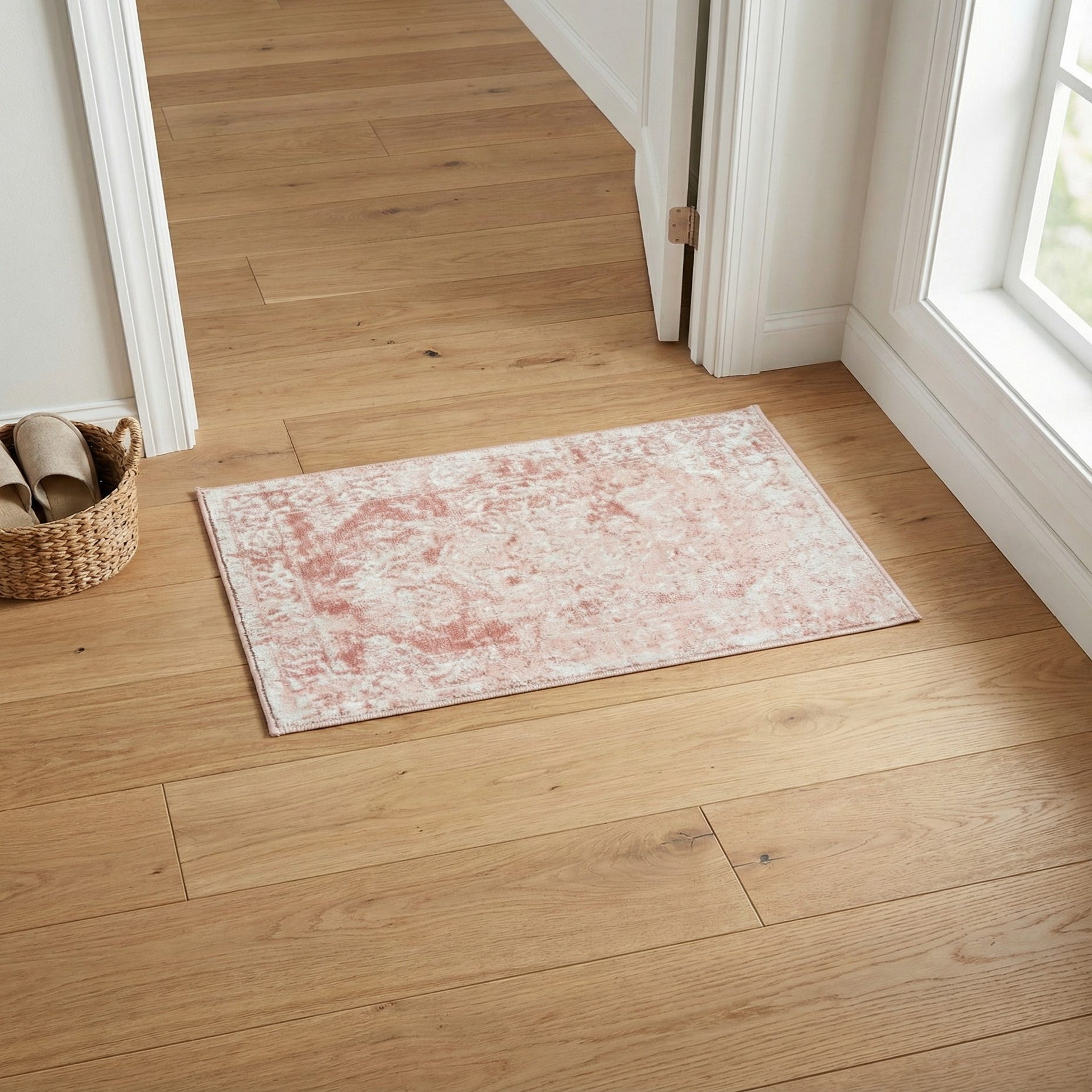 Primary color is Pink. Colors in this rug include: Pink, Ivory.