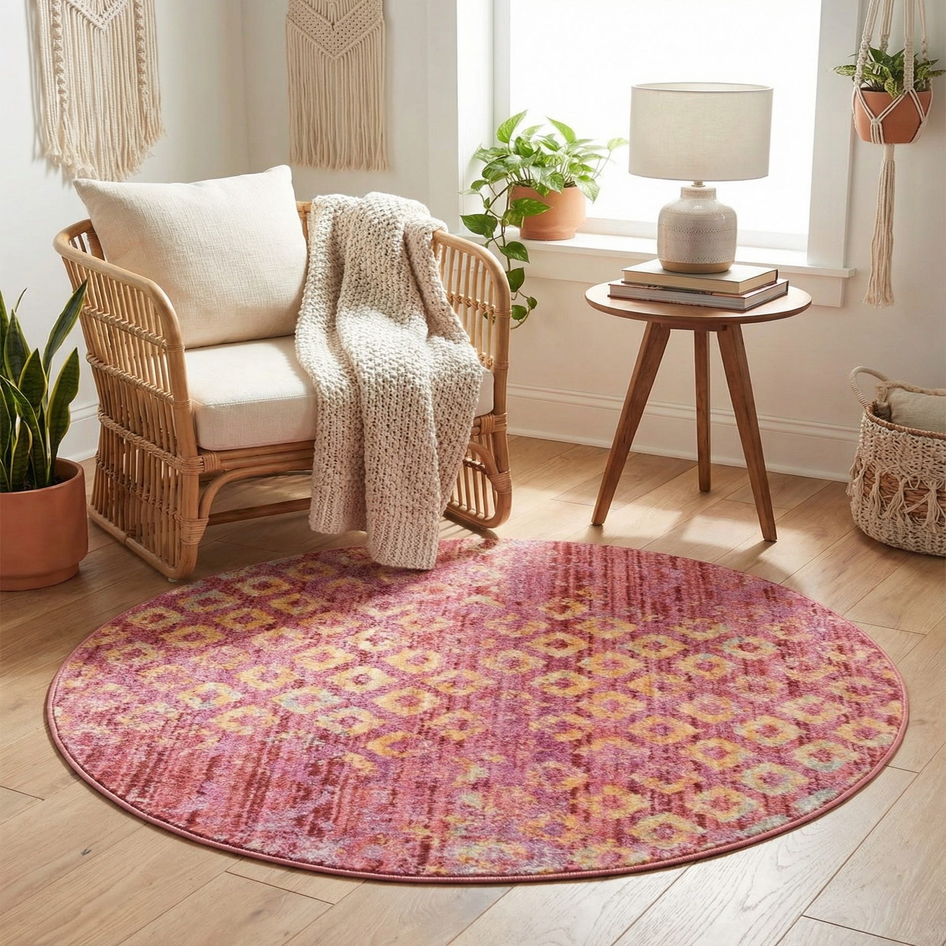 Primary color is Pink. Colors in this rug include: Pink, Burgundy, Gold, Light Blue.