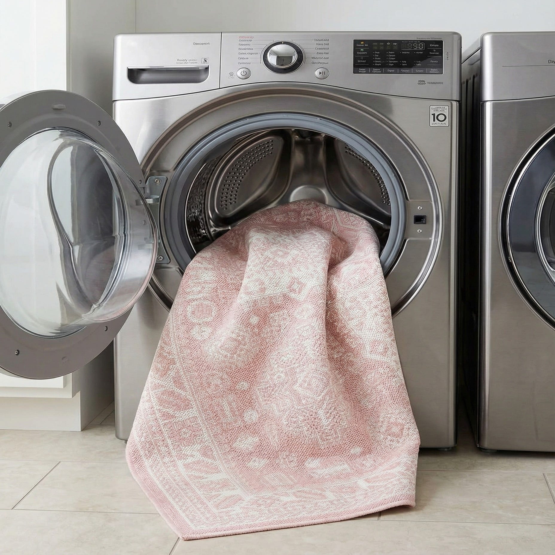 Primary color is Pink. Colors in this rug include: Pink, Ivory.