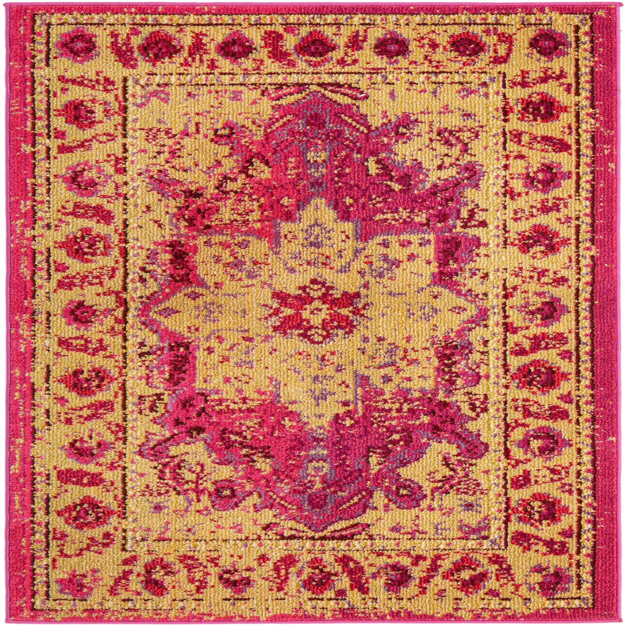 Primary color is Pink. Colors in this rug include: Pink, Burgundy, Gold, Purple, Ivory.